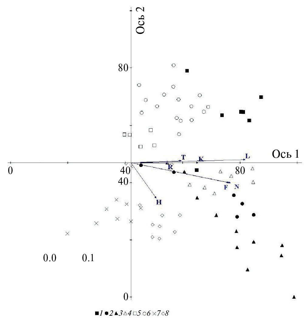 Ординация проведена в программе PC-ORD (McCune, Mefford, 2006), графический модуль которой отображает на ординационной диаграмме тренды тех характеристик местообитаний, у которых хотя бы с одной ординационной осью корреляция (коэффициент Пирсона) превышает 0.4 по абсолютному значению. В матрицу характеристик местообитаний включены оценки описаний по шкалам E. Landolt et al. (L – освещенность; R – кислотность/щелочность; N – богатство азотом; T – теплообеспеченность; К – континентальность; H – гумусированность почвы; F – увлажнение почвы) (2010).