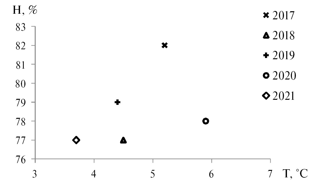 Пять лет измерений были контрастными по температурно-влажностным погодным условиям (рис. 1). Мониторинг температуры воздуха показал, что за период измерений наиболее холодным был февраль 2018 г. (–19 °С), а наиболее теплым – июль того же года (+19 °С). Средняя температура воздуха за летний период 2017, 2018 и 2019 гг. составила 15.3, 17.1 и 15 °С. Средняя температура в нижней части лесной подстилки в эти же периоды составила 13.1, 14.1 и 12.8 °С соответственно. Наибольшее количество осадков выпало в летний период 2017 г. (230 ± 35 л/м2) и 2018 г. (205 ± 30 л/м2), наименьшее – в 2019 г. (106 ± 20 л/м2). Объем почвенных вод в целом согласуется с объемом выпавших осадков.