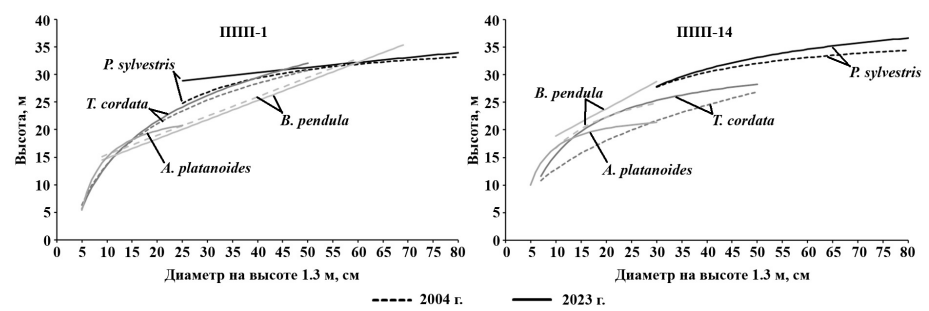 В 2004 году на ППП-1 средняя высота сосны обыкновенной составляла 31.5 м, средний диаметр – 55.5 см. Прирост по диаметру за 20 лет составил более 4 см. Средняя высота сосны обыкновенной увеличилась на 0.7 м. В 2023 году средняя высота сосны обыкновенной составила 32.2 м, а средний диаметр – 59.8 см. Для сосны обыкновенной в X–XI классах возраста рост в высоту вышел на плато. За 20-летний период отмечается продолжение роста в высоту, в том числе в возрасте сосны обыкновенной более 200 лет. Средняя высота липы сердцевидной была равна 17.8 м в 2004 году, и за исследуемый период липа увеличилась на 6.4 м и достигла 24.2 м. На ППП-1 за исследуемый период отпад старовозрастной березы повислой по количеству стволов составил 42.8 %, в результате чего соотношение диаметра и высоты уменьшилось (рис. 1).