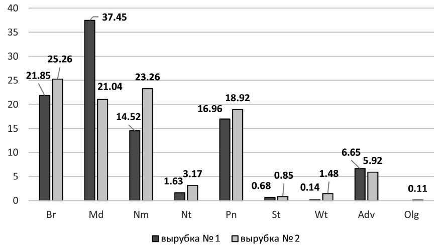 Рис. 3. Спектр ЭЦГ на вырубках в долях относительного участия (%). Расшифровка обозначений: Br – бореальная ЭЦГ; Md – луговая; Nm – неморальная (виды широколиственных лесов); Nt – нитрофильная (виды черноольшаников); Pn – боровая (виды сосновых лесов); St – степная; Wt – водно-болотная; Adv – чужеродные виды; Olg – олиготрофные виды.
