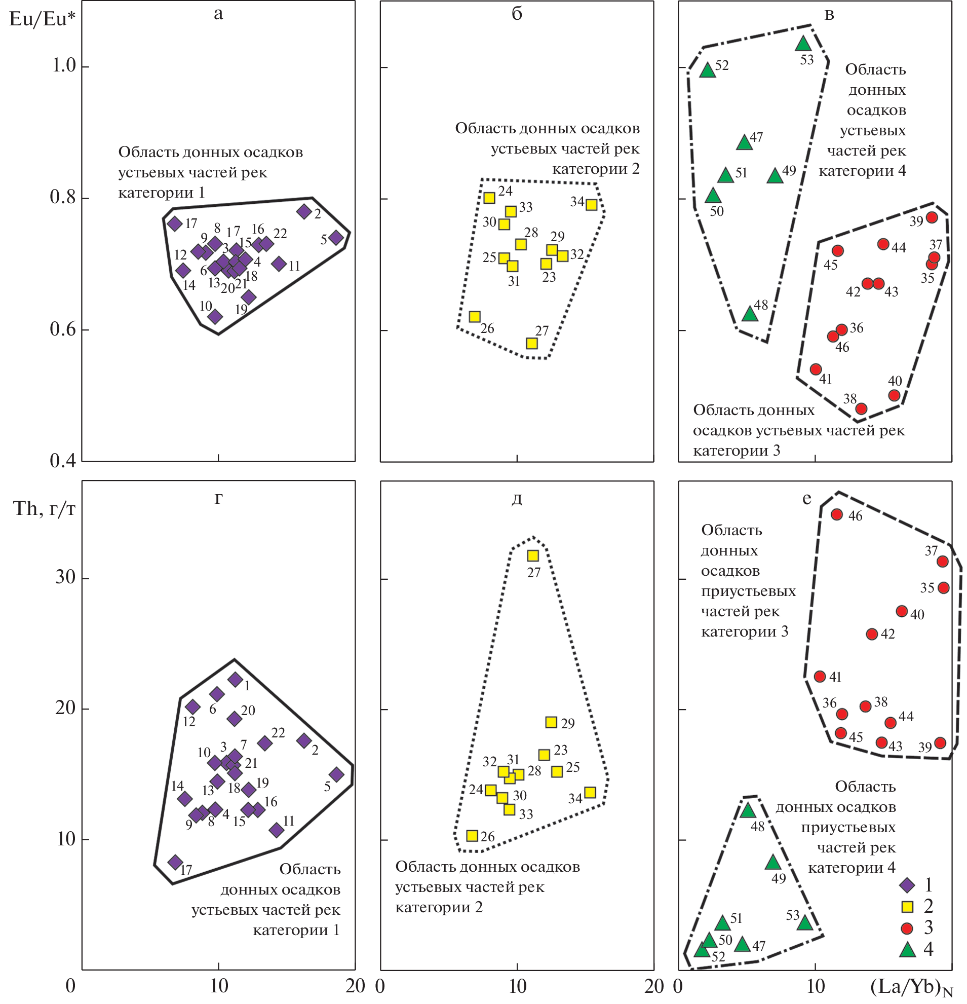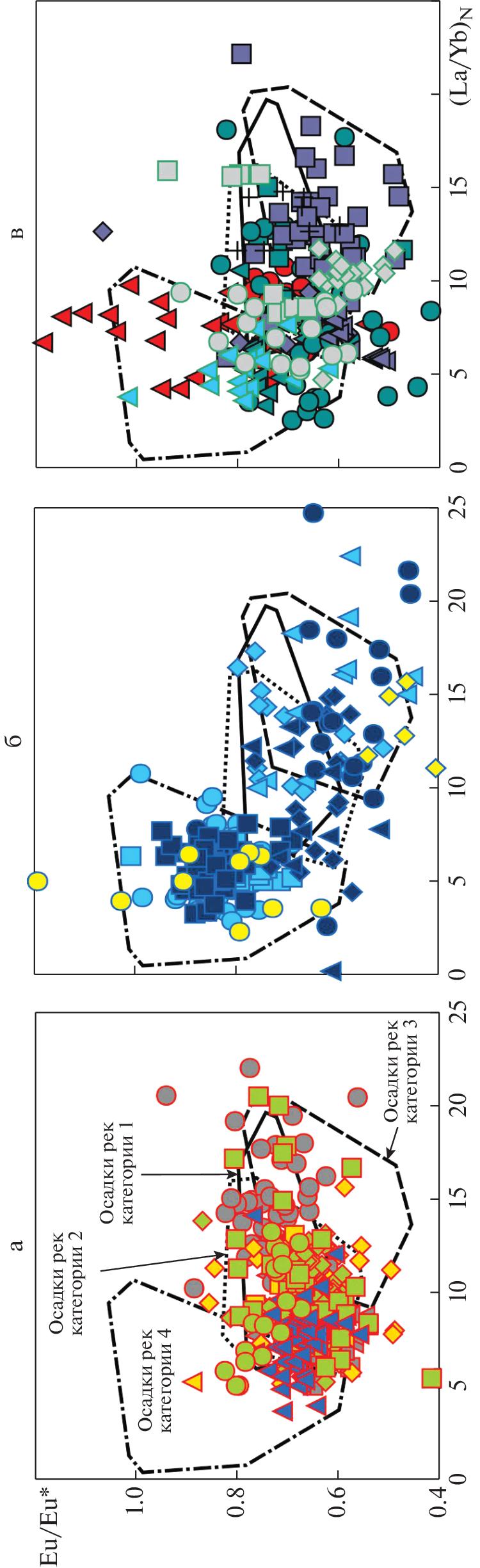 The article analyzes the position of the mudrock data points (points of individual and average samples) of almost 40 sedimentary sequences of the Neoproterozoic-Ordovician (the era of the absence of land plants) and the Devonian-Holocene (the time of the emergence and widespread distribution of land plants, the “green era”) on the diagrams (La/Yb)N–Eu/Eu*, (La/Yb)N–(Eu/Sm)N and (La/Yb)N–Th with classification fields of silty-pelitic particulate matter of estuarine parts of different modern rivers categories. No fundamental differences between the rivers of the “green era” and the pre-Silurian rivers have been revealed in this material. This suggest (in combination with other data) that in the absence of terrestrial vegetation (and not only in the Neoproterozoic–Ordovician), the categories of rivers that drained catchments of different square and composition and transported fine-grained particulate material to the shelf zones were not fundamentally different from those at present.