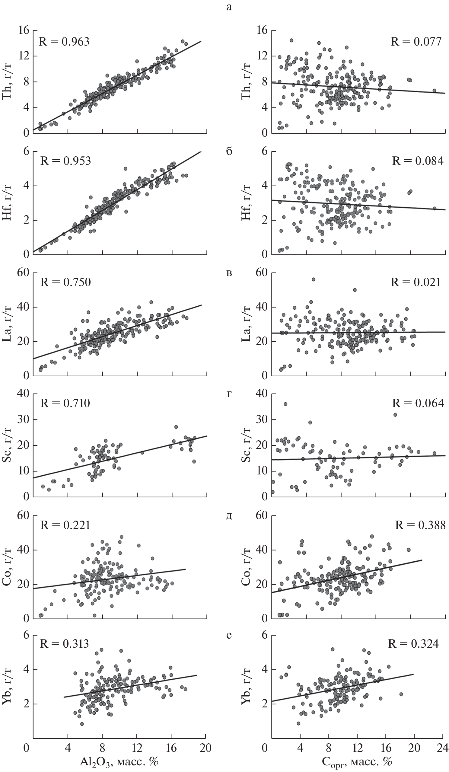 For the rocks of the Upper Jurassic-Lower Cretaceous Bazhenov formation, a significant positive linear dependence of the Th, Hf, Sc, La content on the Al2O3 content was revealed, and their terrigenous genesis was confirmed. It has been determined that the samples in which the distribution of the values of the Sc/Al2O3 and La/Al2O3 ratios does not satisfy the linear dependence are mixed clayey-siliceous rocks with a P2O5 content >1 mas. % or substantially pyritized (in which the content of pyrite exceeds the content of S and C/S ≤ 1), as well as siliceous mudstones with a SiO2 content >70 mas. % by weight. It is concluded that before analyzing geochemical indicators for reconstructing the conditions of formation of the Bazhenov formation, in addition to carbonated rocks, rocks of the above types, as well as rocks that have undergone late diagenetic kaolinization, should be excluded from the analysis. The conditions of formation of the studied deposits were reconstructed based on the analysis of the values of a number of geochemical modules and indicators. As a result of the study of CIA, CIW variations, it was confirmed that the climate in the Late Jurassic-Early Cretaceous period in the West Siberian sedimentary basin was warm, semiarid. It was revealed that during the entire period under review, it did not change significantly. For the deposits of the Bazhenov formation, a number of indicators such as (La/Yb)N, Eu/Eu*, as well as the distribution of trace element content values on the triangular diagram Th‒La‒Sc, suggest that in the central and southeastern regions of the formation distribution area, the sources of demolition of the mafic composition prevailed.