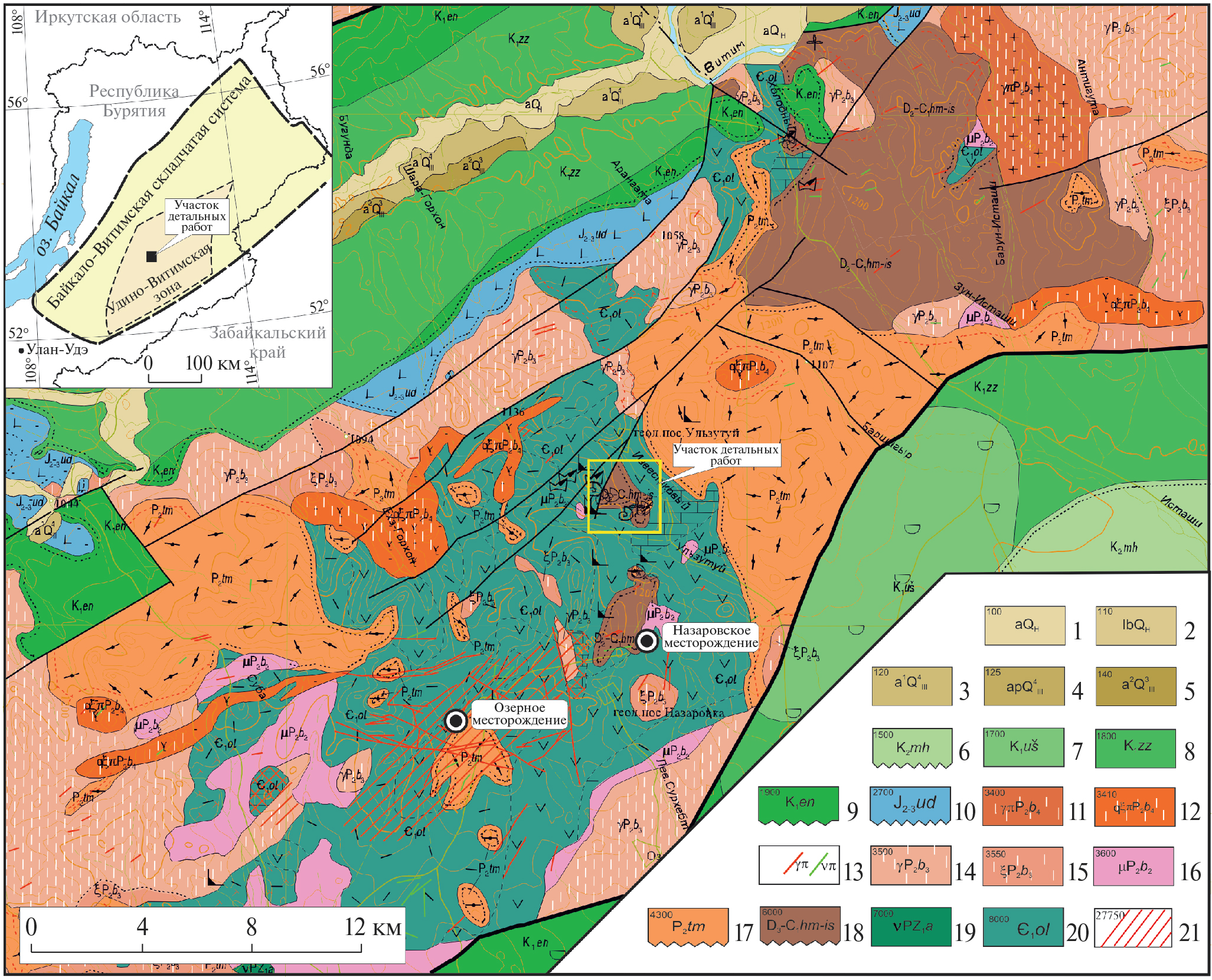1–5 – четвертичные отложения: 1 – аллювиальные, русловые и пойменные (aH); 2 – озерные и болотные (l, bH); 3 – аллювий первой террасы (а1III-H); 4 – аллювиально-пролювиальные отложения (a, pIII-H); 5 – аллювий второй террассы; 6 – мохейская свита (К2mh); 7 – ушмунская свита (К1uš); 8 – зазинская свита (К1zz); 9 – ендондинская (К1en); 10 ‒ удинская свита (J2‒3ud); 11–16 – бичурский комплекс, габбро-монцонит-гранитовый (P2b): 11 – гранит-порфиры (gpP2b4), 12 – граносиенит-порфиры (gxpP2b4), 13 – диоритовые порфириты (dpP2b4), габбро-порфириты (npP2b4), 14 – граниты, граносиениты (egP2b3), 15 – граниты, лейкограниты, граносиениты (gxP2b3), 16 – кварцевые монцониты, монцодиориты, гранодиориты (mP2b2); 17 – монцогаббро, габбро (νP2b1); 18 – тамирская свита (P2tm); 19 – химгильдинская и исташинская свиты, нерасчлененные (D3–C1is-hm); 20 – олдындинская свита (Є1ol); 21 – гидротермально-метасоматические изменения, без расчленения. На врезке: тектоническая схема Байкало-Витимской складчатой системы (упрощена) с местоположением Удино-Витимской зоны и участка детальных работ.