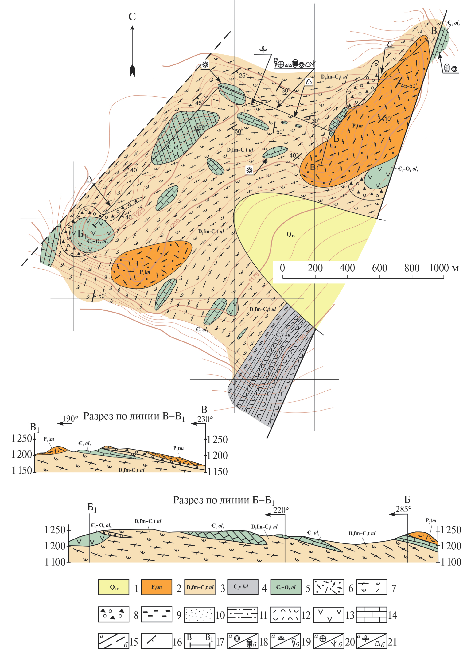 1 – четвертичные отложения (Q); 2 – тамирская свита (P2tm); 3 – ульзутуйская толща (D3 fm–С1tul); 4 – кыджимитская толща (C1vkd); 5 – олдындинская свита (Є1–О2ol); 6 – псефитовые туфы трахириолитов; 7 – переслаивание пестроцветных туфопесчаников, туфоалевролитов, туффитов, туфоаргиллитов, алевритистых и детритовых известняков; 8 – конглобрекчии; 9 – туффоаргиллиты, глинисто-кремнистые аргиллиты; 10 – полимиктовые песчаники с линзами гравелитов, карбонатных песчаников; 11 – алевролиты известковистые; 12 – туффиты пепловые, кислого состава; 13 – андезиты; 14 – биогермные известняки; 15 – тектонические нарушения: а – достоверные, б – предполагаемые; 16 – элементы залегания; 17 – линия разреза; 18–21 – места находок органических остатков: 18 – археоциаты (а), трилобиты (б); 19 – строматопороидеи (а), тентакулиты (б); 20 – мшанки (а), водоросли (б); 21 – флора (а), миоспоры (б).
