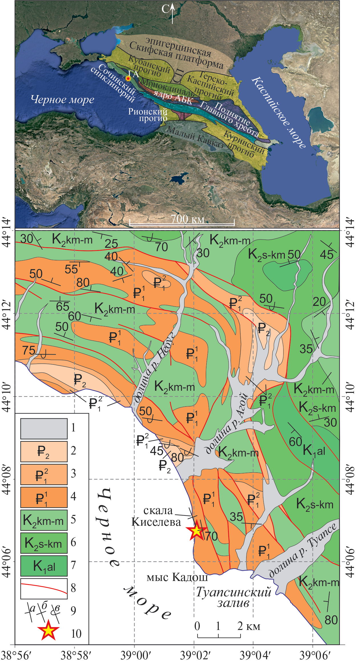Рис. 2. Тектоническая зональность Кавказа (вверху) и схема геологического строения Небуг-Туапсинского района (внизу) составлена по материалам из работ [Корсаков и др., 2002, 2021; Маринин и др., 2017] с упрощениями и дополнениями по результатам собственных полевых исследований авторов