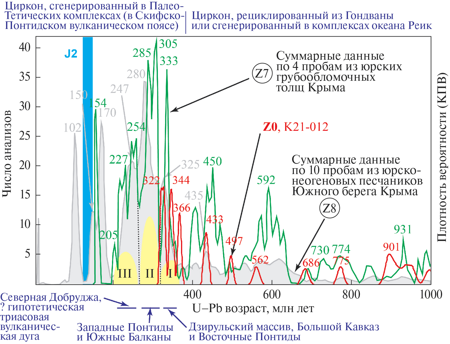Для построения гистограммы и кривой плотности вероятности (КПВ) использованы анализы (кондиционные датировки), удовлетворяющие трем условиям: 1) –10% < D1 и D2 < 10%; 2) аналитическая ошибка измерений обеспечивает точность оценки возраста < 50 млн лет и 3) поправка на общий свинец меняет возраст < 50 млн лет.