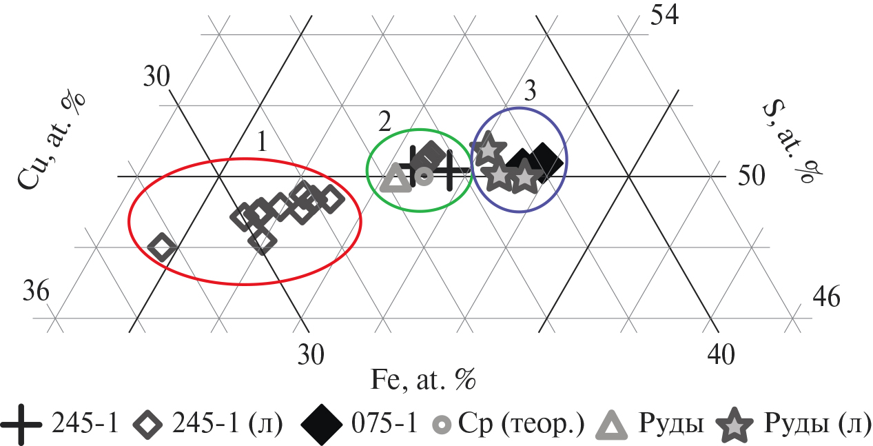 Группа 1 – халькопирит из ламелей (л) неидентифицированной фазы из верхнего горизонта осадков станции 37L245g; группа 2 – теоретический состав халькопирита, халькопирит из верхнего горизонта осадков станции 37L245g и из сульфидных руд гидротермального узла Победа (ст. 37L204d, неопубликованные данные авторов); группа 3 – халькопирит из верхнего горизонта осадков станции 37L075k и из ламелей (л) в сульфидных рудах гидротермального узла Победа (ст. 37L204d и cт. 37L107d, неопубликованные данные авторов).