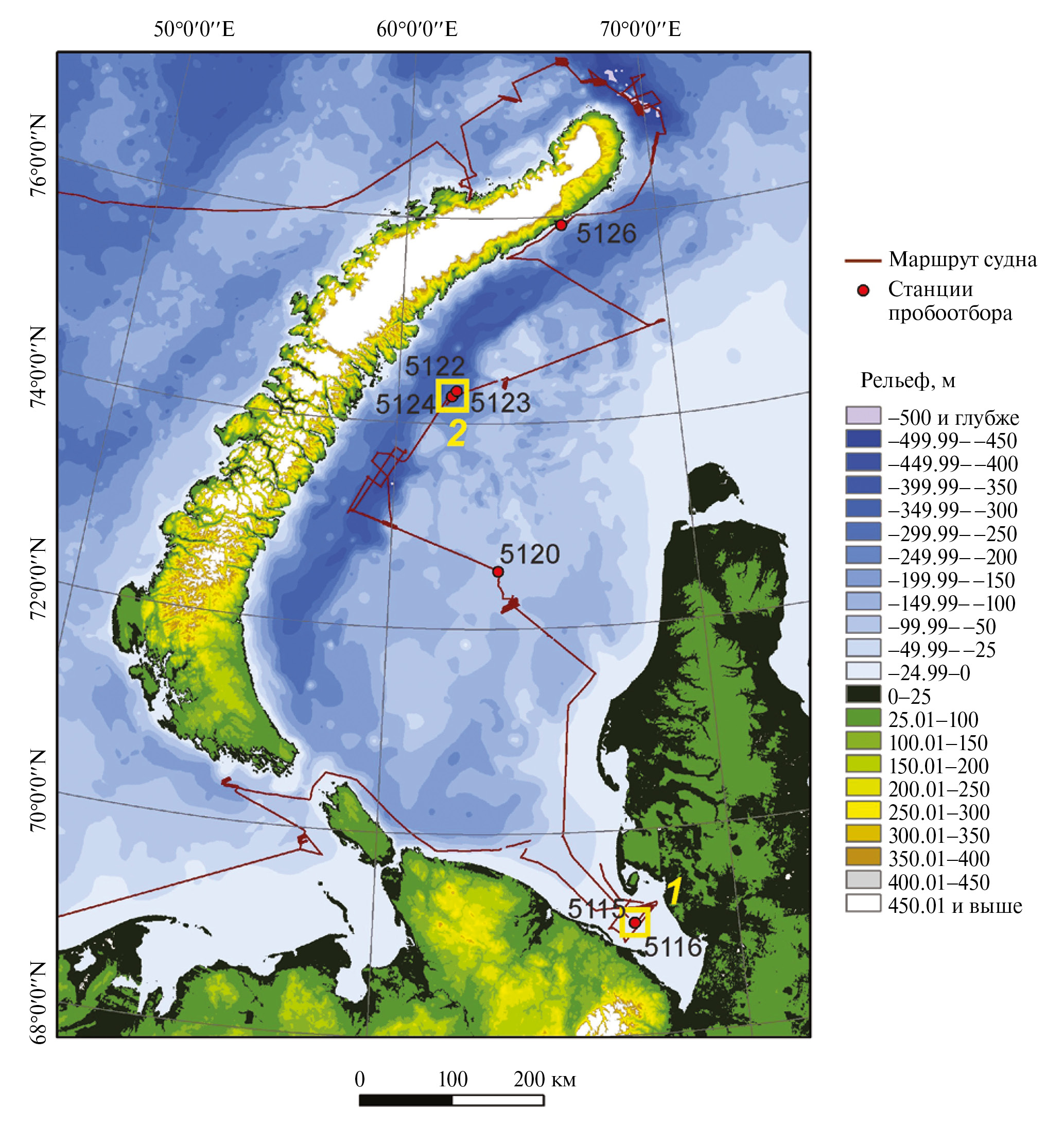 Рис. 1. Маршрут 51 рейса НИС “Академик Борис Петров” и положение станций пробоотбора, рассматриваемых в статье. Рельеф показан по данным IBCAO версии 3. Желтые квадраты – положение полигонов детальной батиметрической съемки, представленных на рис. 2а (1) и 2в (2)