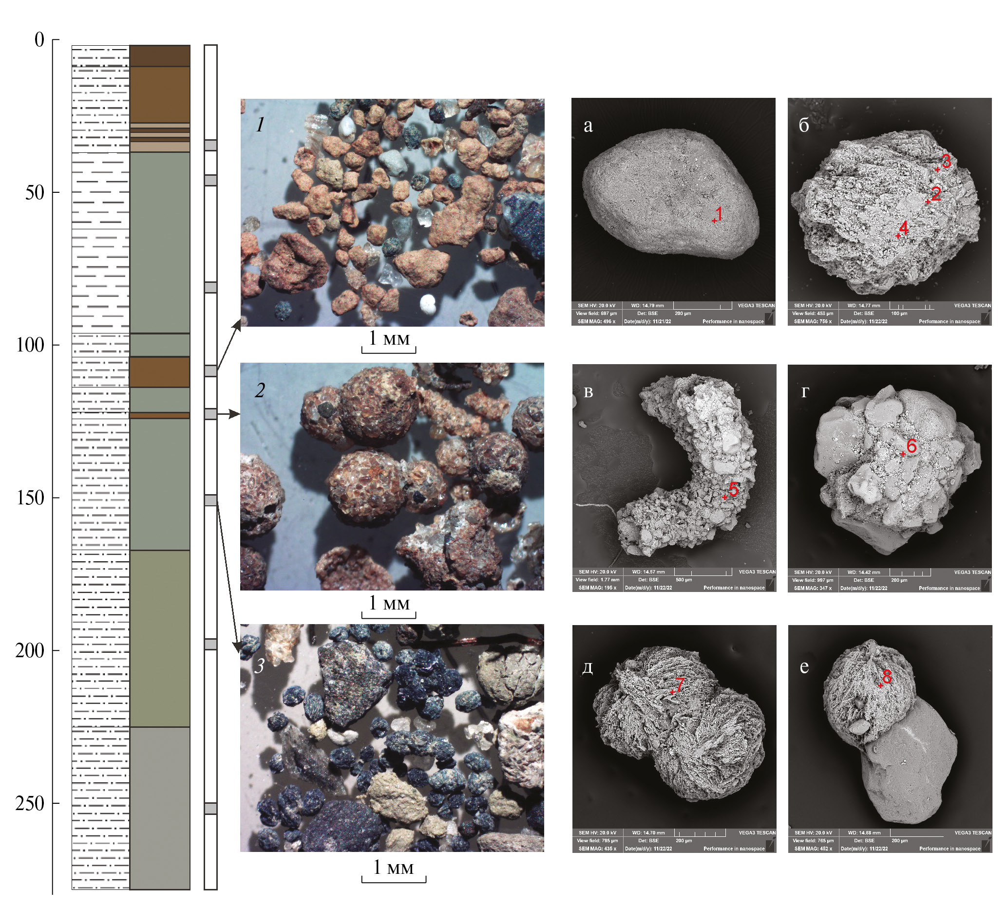 Согласно данным СЭМ в рассматриваемых интервалах преобладают железистые стяжения (см. табл. 2, рис. 4). Концентрации железа высоки и в цементирующем веществе трубчатых и сферических склеек. На рассматриваемых уровнях встречаются также марганцевые стяжения, однако в значительно меньшем количестве. Они имеют темно-коричневый и черно-коричневый цвет (см. табл. 2).