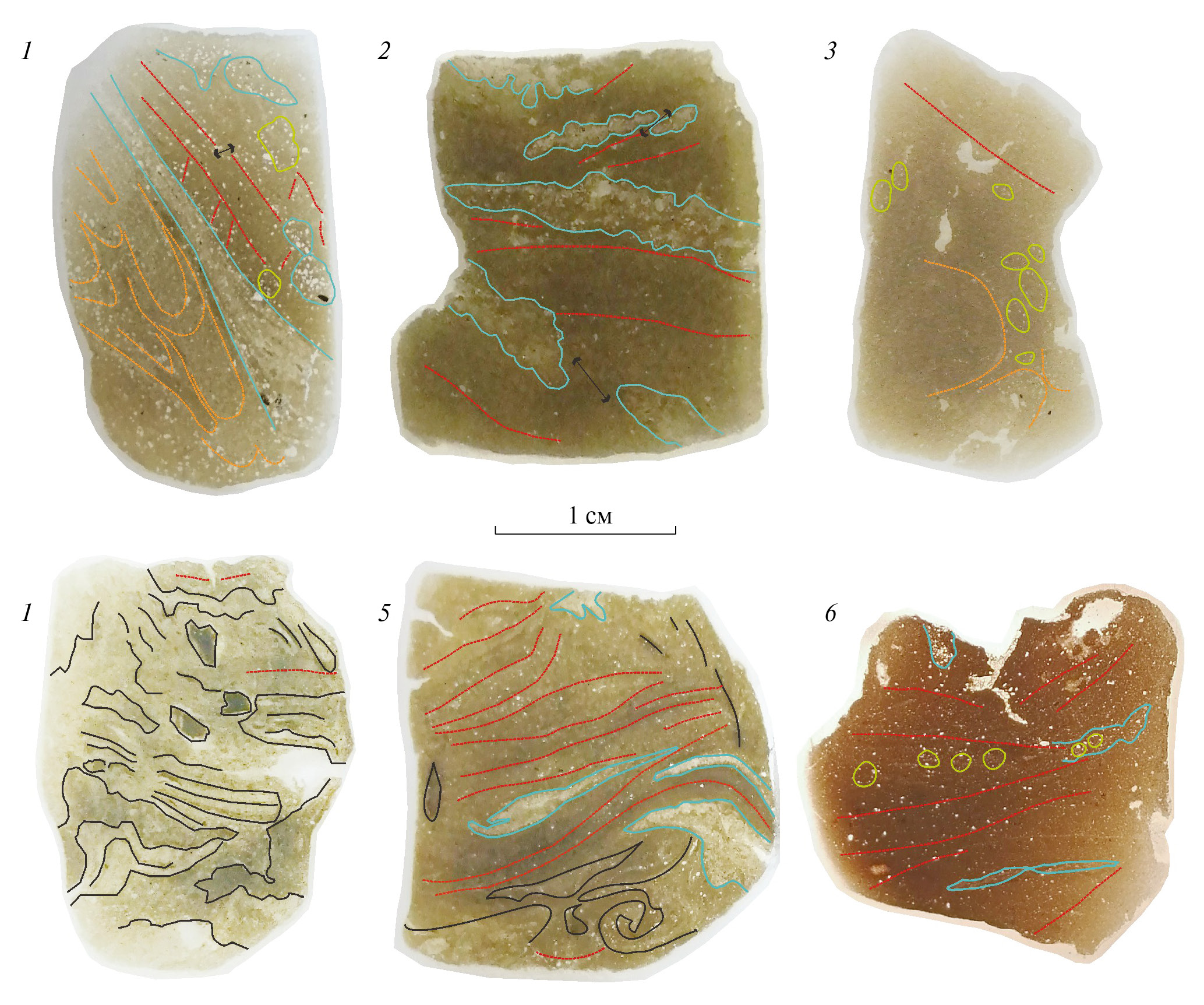 Интервалы для изготовления петрографических шлифов, колонка 5115: 1 – 49–52 см, 2 – 77–79 см, 3 – 86–90 см; колонка 5116: 4 – 57–62 см, 5 – 73–77 см, 6 – 98–100 см. Цветом обозначены следующие структурно-текстурные особенности: красный пунктир – линия ориентировки линейного расположения минеральных зерен, оранжевый пунктир – линия дугообразной ориентировки минеральных зерен, желтый – круговая ориентировка минеральных зерен (ротационная структура), голубой – линзы крупнозернистого песчаного материала, черный – зоны окрашивания тонкодисперсным органическим веществом. Стрелками обозначены микроразрывные нарушения