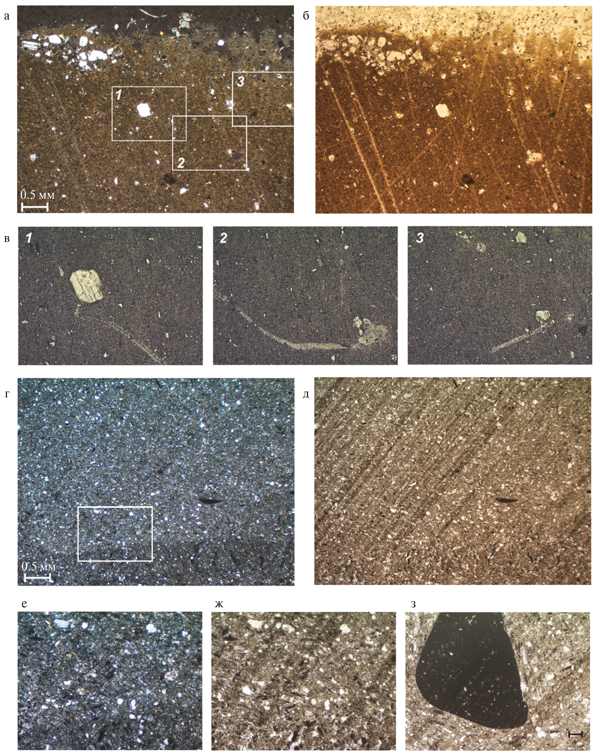 В образце из нижней части колонки 5126 (84– 88 см) штриховка выражена цветовой микрополосчатостью (см. рис. 6г‒6з). Возможно, это связано с высоким содержанием битуминозного вещества в образце, которое дает окрашивание по направлению действующего давления. Полосы располагаются неравномерно (см. рис. 6г, 6д), проходят по поверхности крупнозернистых включений (см. рис. 6з), что свидетельствует об их формировании уже после осадкообразования. В петрографических шлифах образцов выше и ниже рассматриваемого слоя микроштриховка отсутствует, либо наблюдаются единичные штрихи. В целях обнаружения проявлений микроштриховки в осадочных последовательностях шлифы выполнялись как в продольной, так и в поперечной плоскостях данных образцов.