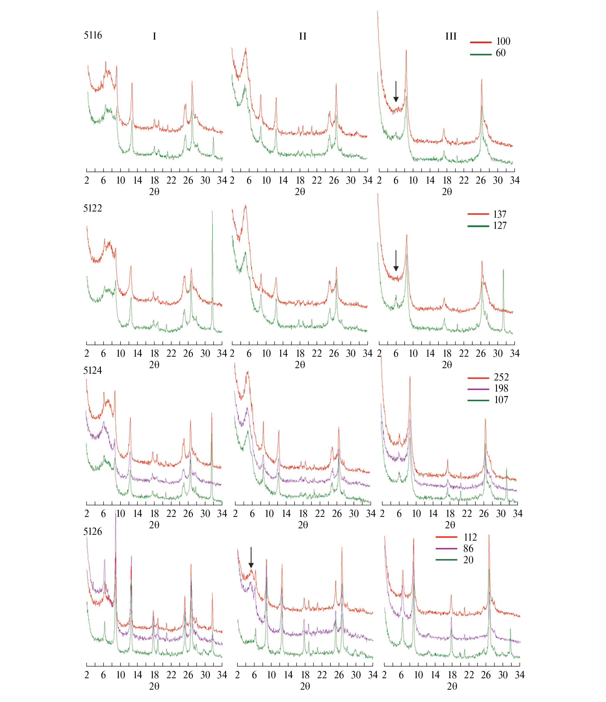 Цвет линии: красный – препараты выполнены из материала в нижней части колонки с высокой прочностью на сдвиг, зеленый – материал верхней части колонки с низкой прочностью на сдвиг, фиолетовый – материал из зон с выраженной микроштриховкой. Черной стрелкой отмечено отсутствие пика хлорита при прокаливании в образцах ниже границы предполагаемого экзарационного воздействия в колонках из экзарационных борозд (5122, 5116). 5124, 5126 – фоновые колонки. Черной стрелкой для колонки 5126 отмечено проявление пика смектита при насыщении этиленгликолем в нижних образцах и его отсутствие в верхнем
