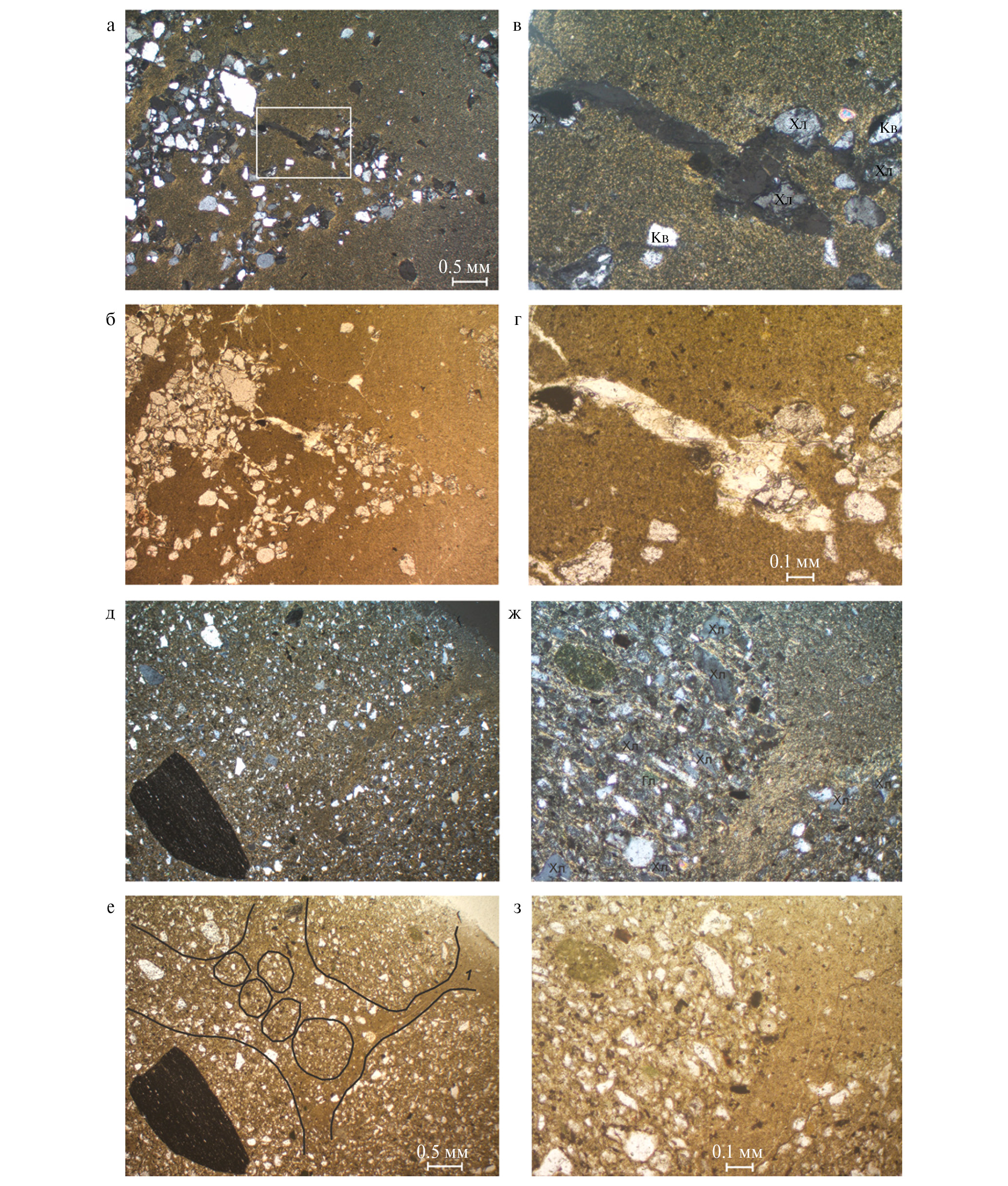Образец 5122_137 (ниже контакта), петрографический шлиф, проходящий свет с анализатором (д, ж) и без анализатора (е, з); ж, з – увеличенный фрагмент на границе зон с различной размерностью и ориентацией зерен обломочного материала, обозначенный на рис. 8е цифрой 1.