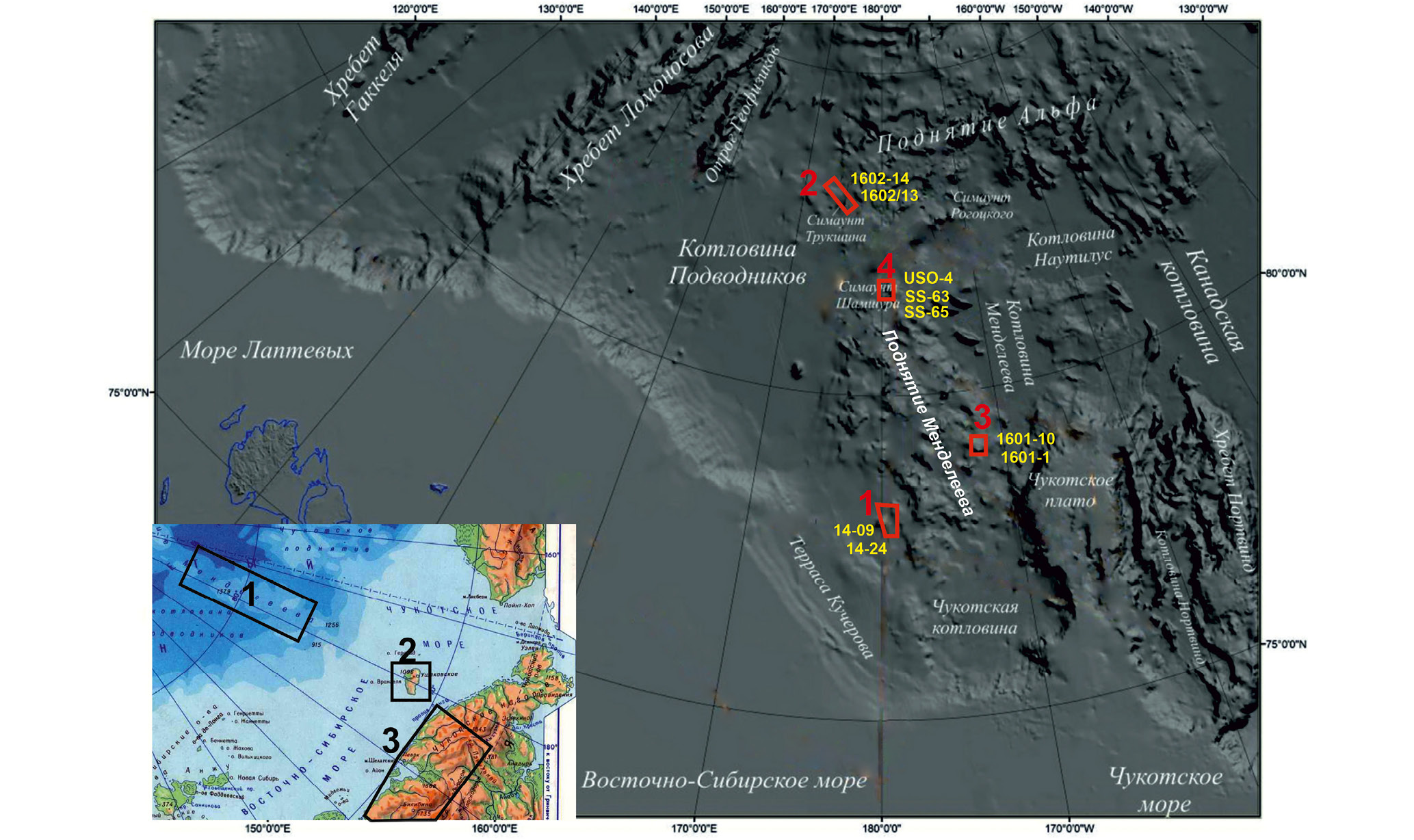 На врезке: фрагмент географической карты арктического региона России с выделенными участками, образцы из которых были использованы в настоящей статье: 1 – поднятие Альфа-Менделеева, 2 – остров Врангеля, 3 – Чукотка.