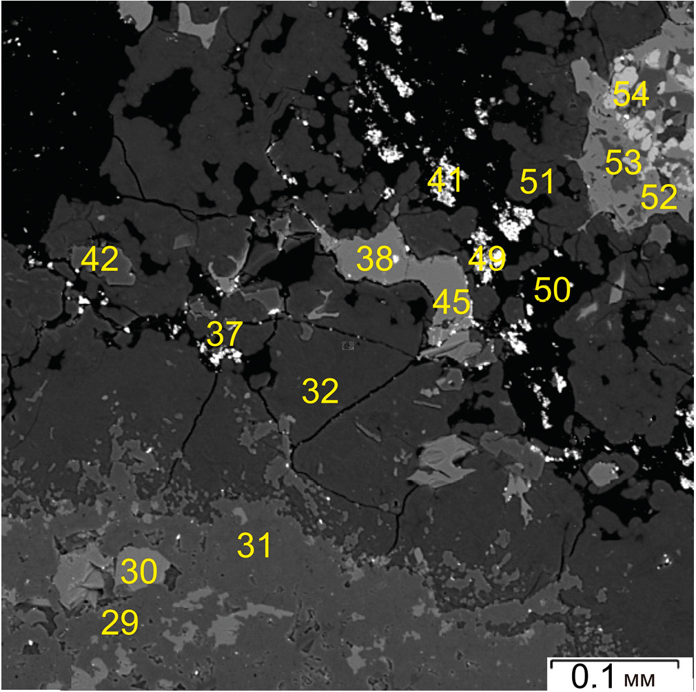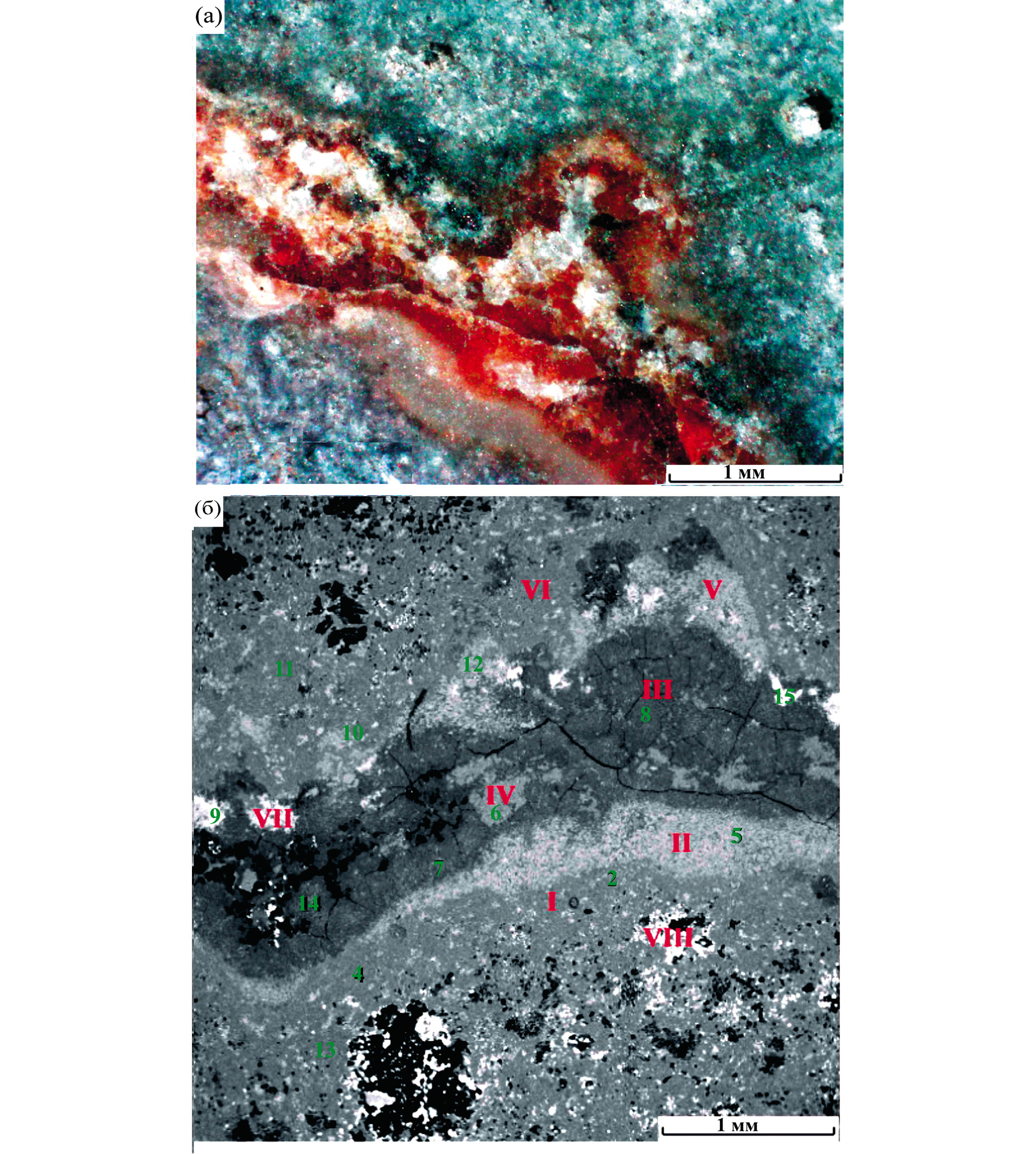 Римскими цифрами показаны минеральные зоны, арабскими – места химических анализов (площадное сканирование СЭМ) (результаты анализов см. табл. 2)