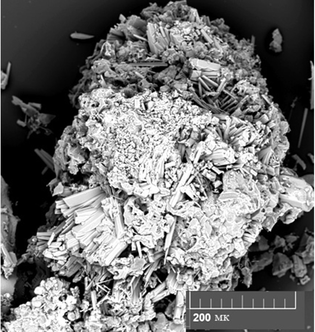 Изучение морфологии и химического состава микрообъектов проводилось на сканирующем электронном микроскопе (СЭМ) Tescan Vega-3 с микрозондовой приставкой Aztec (Чехия, г. Брно). Детектор приставки снабжен майларовым входным окошком, толщиною 0.5 мкм, что позволяло в список определяемых элементов включить углерод и кислород. Структура образцов изучалась при анодном напряжении 30 кВ, ток пучка 50 мкА, химический состав при напряжении 20 кВ. Локальность анализа около 1 мкм. Погрешность химического анализа лежит в рамках 3-й категории точности по требованиям Научного Совета по аналитическим методам. В оксидной форме это записывается как DC = 0.12 · С0.5, где С – содержание оксида в весовых процентах, DC – абсолютная погрешность. Объектом электронно-микроскопических исследований служили непокрытые полированные шлифы, сцементированные органическим материалом и напыленные золотом.