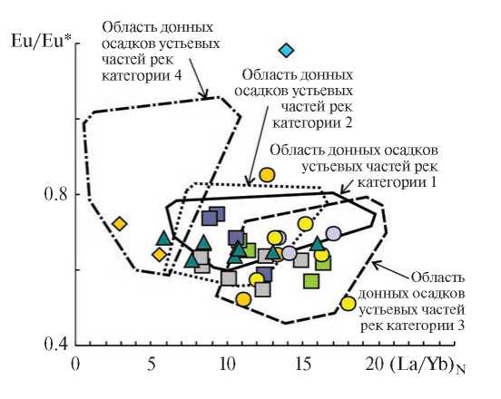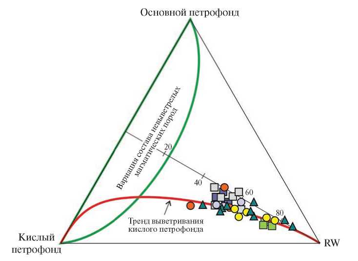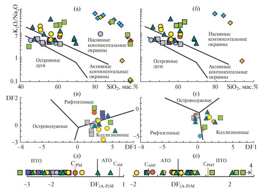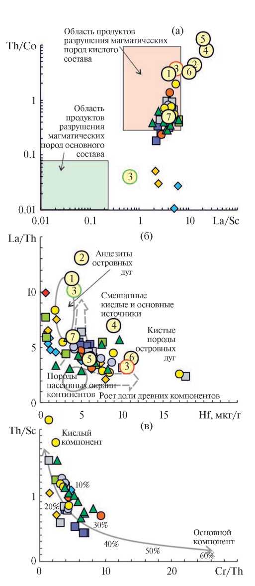 Так как в некоторых образцах силикатная матрица корродирована карбонатными минералами, а в ряде образцов алевролитов и аргиллитов по геохимическим критериям диагностированы акцессорный апатит и бертьерин, то такие образцы использованы в настоящем исследовании “с осторожностью” либо не были использованы при построении различных дискриминантных диаграмм. Наиболее подходящими в нашем случае для реконструкции петрофонда являются диаграммы, использующие такие элементы, как V, Cr, Ni, Rb, Zr, Hf, Th, Sc и некоторые РЗЭ, и те или иные их индикаторные отношения.