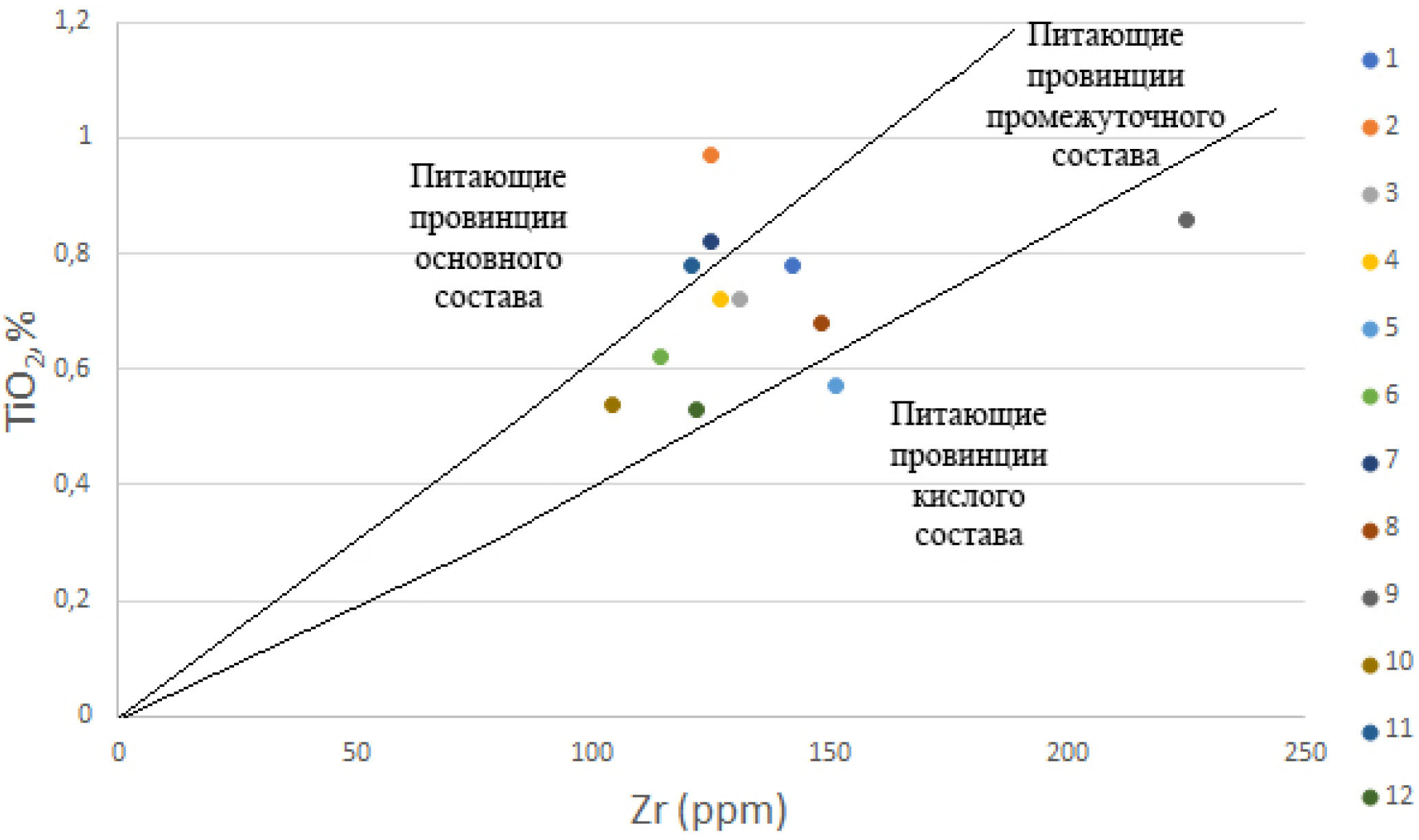 Анализ соотношения TiO2 и Zr в разных типах плейстоценовых осадков по методике [Bracciali et al., 2007] позволяет прийти к выводу о том, что среди пород питающих провинций обоих океанов в течение плейстоцена доминировали породы среднего состава (рис. 2).