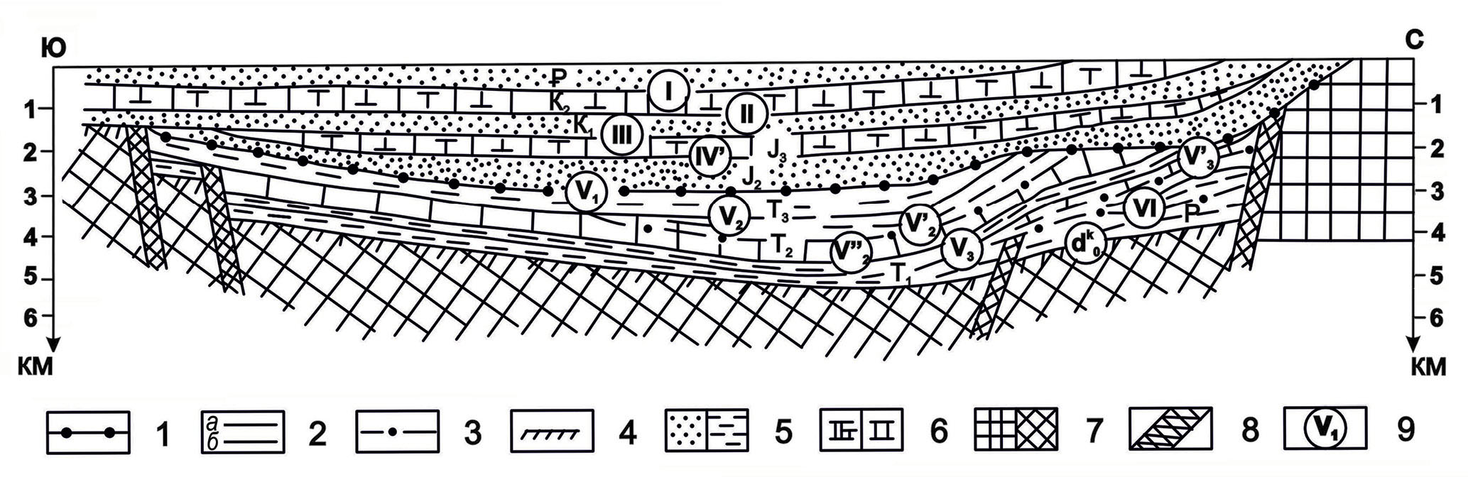 1 – граница сейсмокомплексов; 2 – отражающие горизонты в юрско-меловых сейсмокомплексах; 3 – опорные отражающие горизонты в триасе; 4 – преломляющие горизонты; 5–7 – состав пород: 5 – терригенные, 6 – карбонатные, 7 – метаморфические (а – высокоградиентные, б – низкоградиентные); 8 – разрывные нарушения; 9 – индексы сейсмических горизонтов.