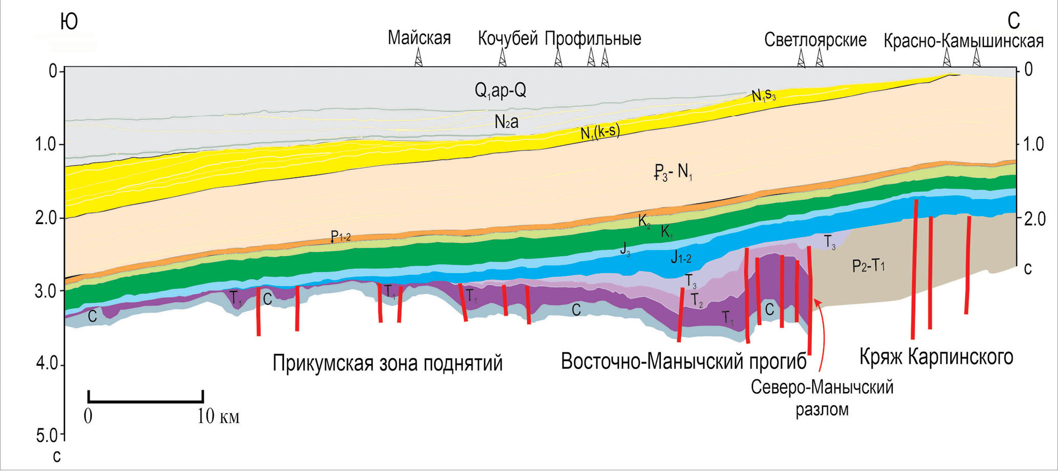Рис. 9. Сейсмогеологический разрез Восточного Предкавказья показывает характер залегания триасовых отложений в Восточно-Манычском прогибе.