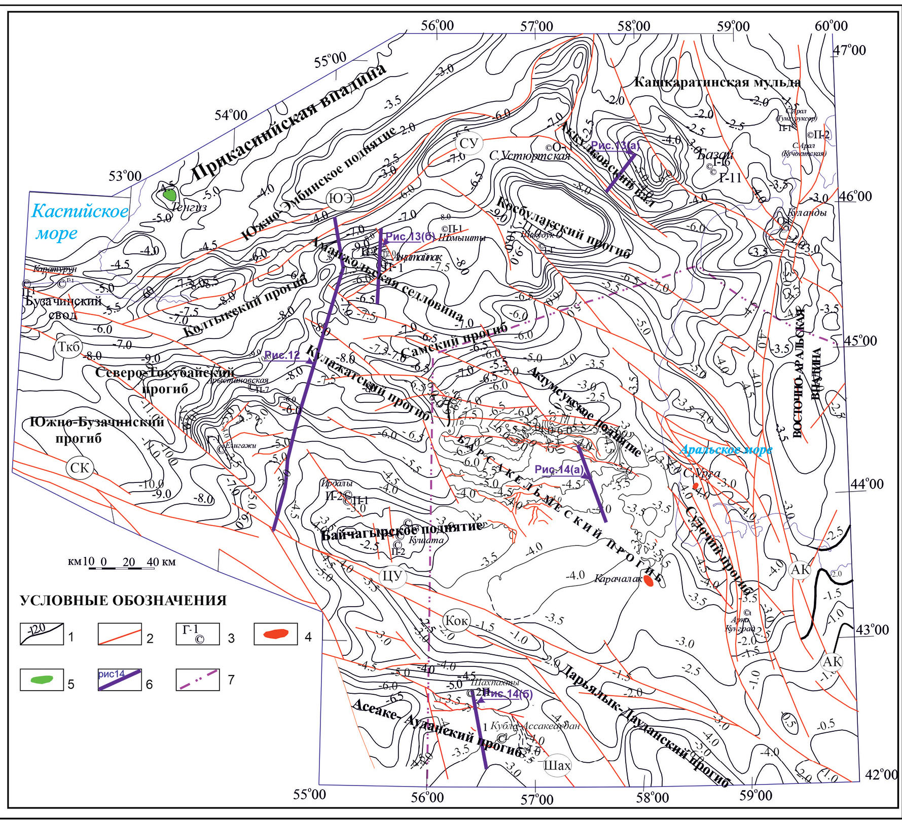 1 – изогипсы отражающего горизонта “б”, км; 2 – основные разломы; 3 – глубокие скважины и их номера; 4 – газовые месторождения; 5 – нефтяные месторождения; 6 – линии сейсмических и сейсмогеологических разрезов, показанных на рисунках в статье; 7 – государственные границы.