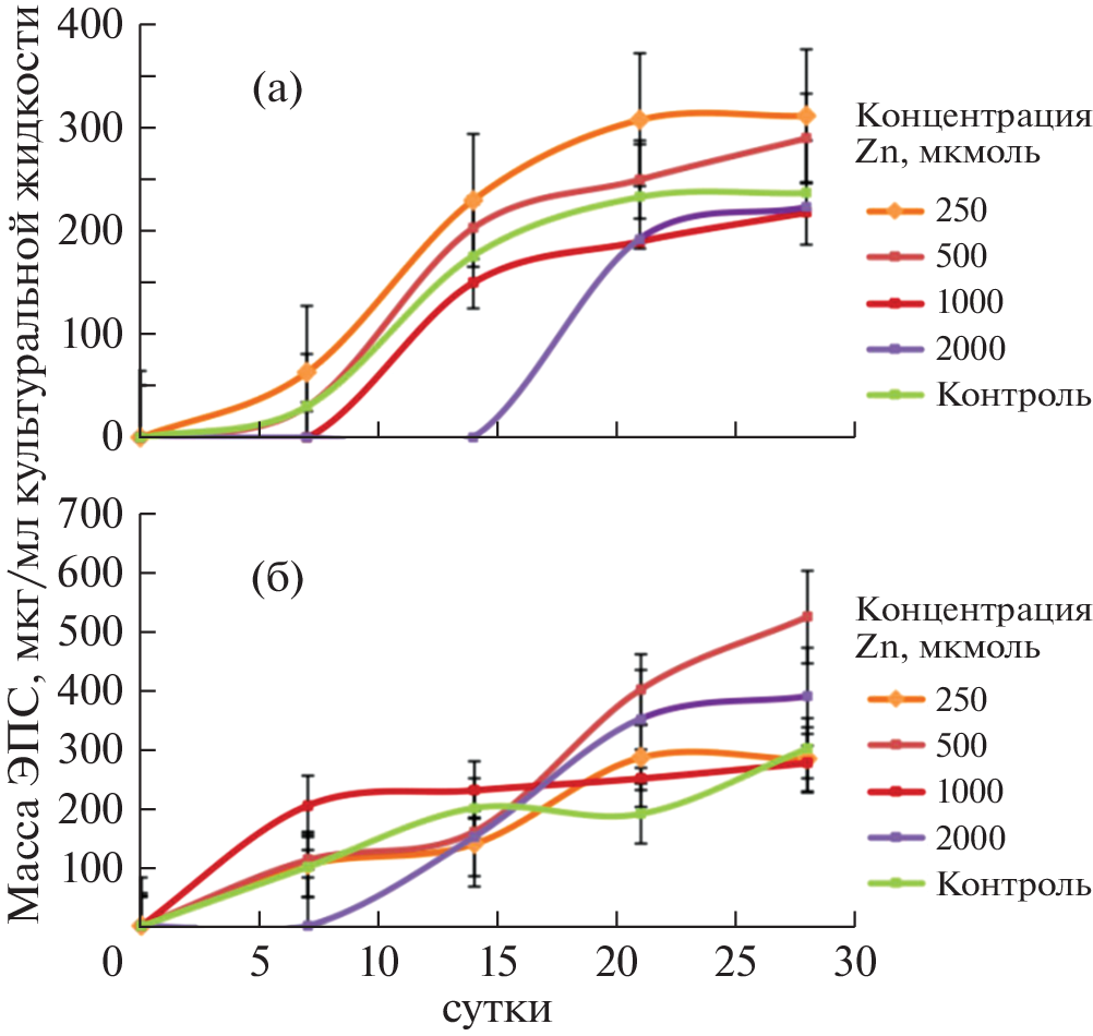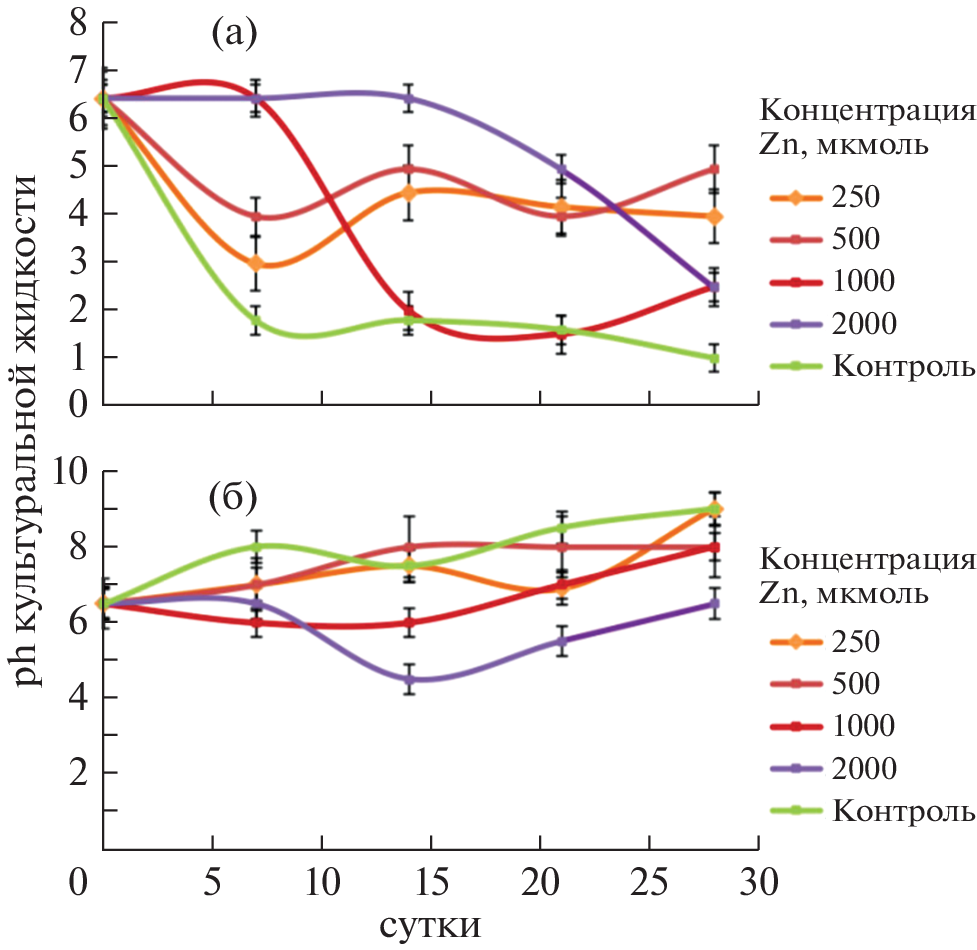 Microfungi are promising objects for bioremediation due to their ability to convert metals into forms that are less mobile and accessible to organisms. The study showed that the fungi Penicillium chrysogenum and Aspergillus niger have physiological mechanisms of extracellular Zn detoxification at its initial concentration of 250 µmol – 2 mmol in the medium. At concentrations of 250–500 µmol Zn promotes the accumulation of biomass and abundant sporulation of A. niger and Penicillium chrysogenum, and at concentrations of 1–2 mmol inhibits the growth of fungi. Extracellular Zn detoxification in Aspergillus niger culture occurs by the formation of dihydrate zinc oxalate katsarosite, due to the active biosynthesis of oxalic acid in A. niger. The main mechanism of zinc detoxification in Penicillium chrysogenum culture was the formation of zinc phosphate hopeite. The formation of zinc phosphate hopeite under the action of the fungus was established for the first time. The key factors that determine the direction of the processes of formation of extracellular mineral phases are the amounts of EPS and oxalic acid produced by fungi, as well as changes in the pH of the medium during the growth of cultures.