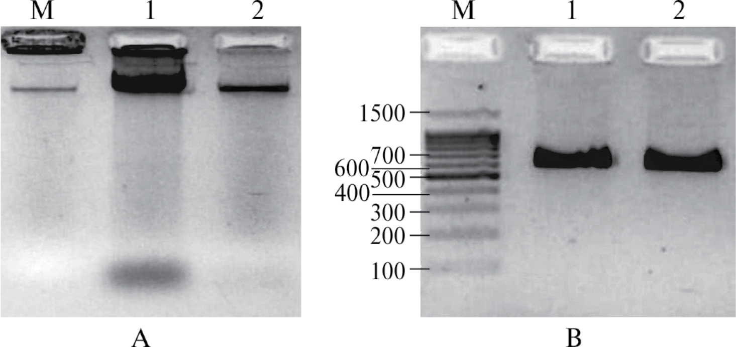 Рис. 1. Геномная ДНК штаммов Trichoderma: 1 — Trichoderma sp. Uz-А21; 2 — Trichoderma sp. Uz-А4; А — геномная ДНК; М — маркер геномной ДНК; В — продукт ПЦР ITS-области штаммов Trichoderma; M — ДНК-маркер длиной 100 п. н.