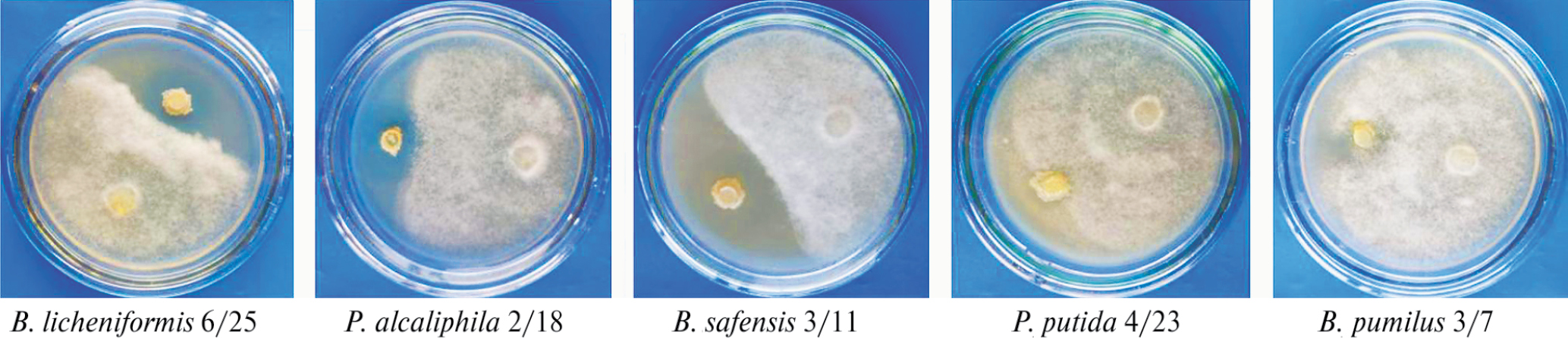 Антагонистические свойства выделенных бактерий в отношении Phytophthora infestans определяли по результатам роста штаммов Ph. infestans в присутствии тестируемых бактерий (табл. 2). Наибольшую активность в подавлении Ph. infestans проявил штамм Bacillus safensis 3/11 (рис. 2, 3). Несколько меньшую активность проявили штаммы Pseudomonas alcaliphila 2/18 и Bacillus licheniformis 6/25. Штамм Pseudomonas putida 4/23 показал слабое ингибирование роста Phytophthora infestans. Штамм Bacillus pumilus 3/7 практически не влиял на рост колоний Phytophthora infestans. Также было отмечено, что штаммы Ph. infestans различались по восприимчивости к действию бактерий: 4МСЛК 26 был более устойчив, чем TVKT-1 (табл. 2).