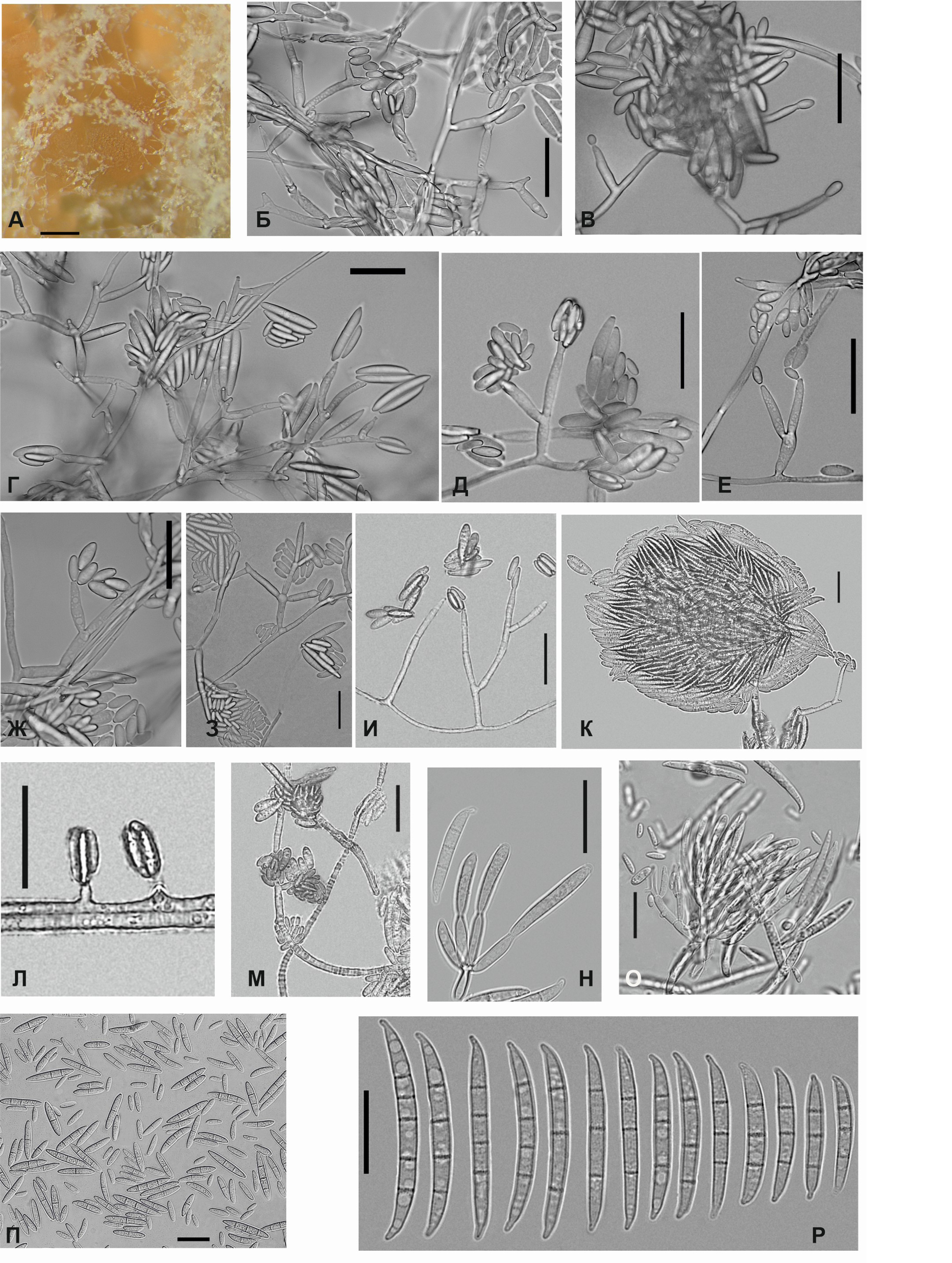 Рис. 3. Микроморфология Fusarium temperatum: A — фальшивые головки в воздушном мицелии над спородохием, расположенном на поверхности агара; Б–И — конидиеносцы, фиалидные и бластические конидиогенные клетки; К — фальшивая головка; Л, М — микроконидии на фиалидных отверстиях на поверхности гифы; Н, О — разветвленные спородохиальные конидиеносцы; П — мезоконидии; Р — серповидные макроконидии. Фотографии И–М сделаны с использованием прозрачной липкой ленты (scotch). Масштаб: A — 200 мкм; B–P — 20 мкм.