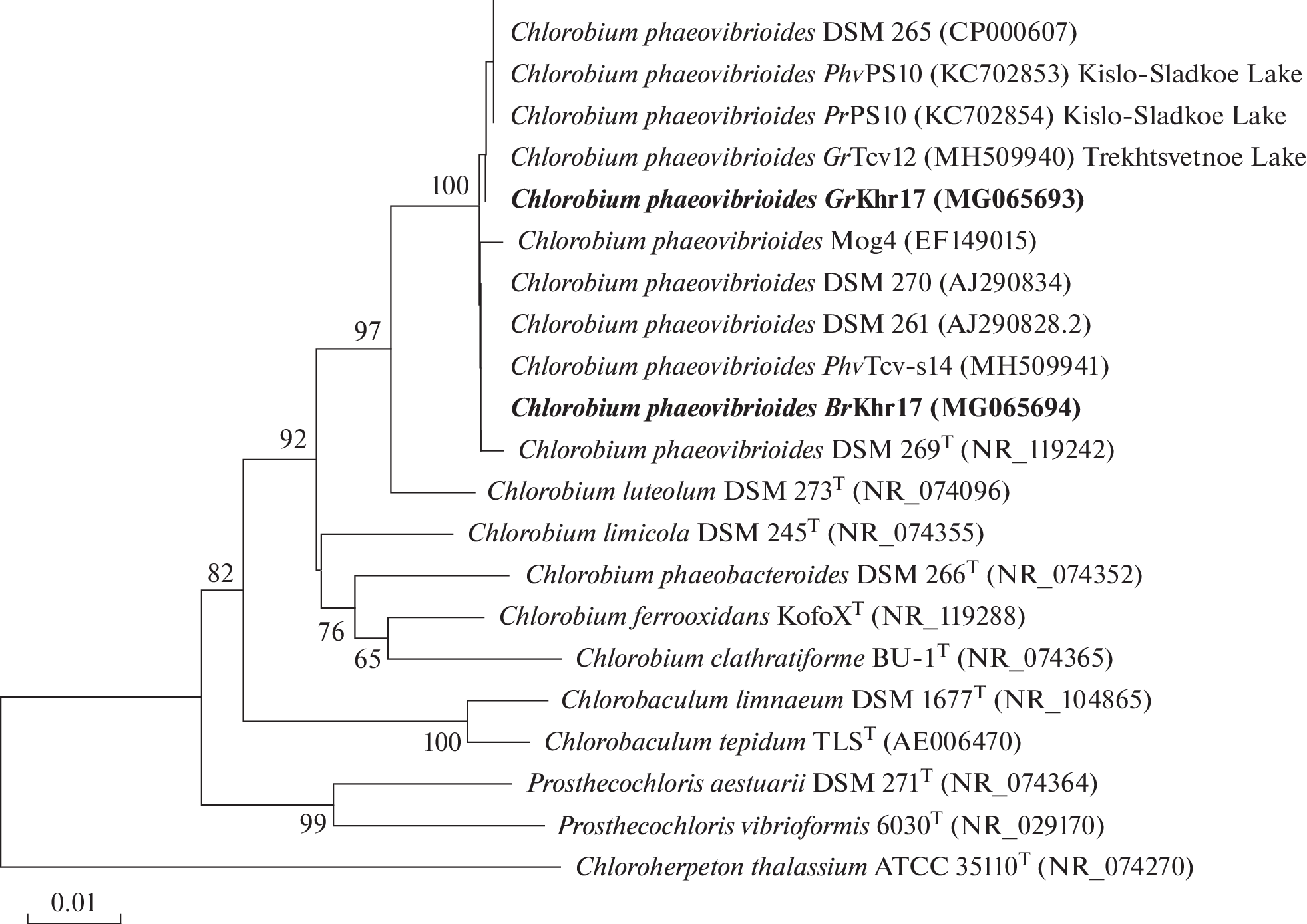 The composition and structure of the anoxygenic phototrophic bacterial (APB) community in the water column of Lake Bol’shie Khruslomeny during winter were investigated. The community developed at the depth of 4.25 m, and its activity during the ice-covered period was very low (6.2 µmol C L–1 day–1). The water in the zone of highest development of phototrophic bacteria was of an unusual lemon-yellow color, probably due to the production and accumulation of polysulfides. The near-bottom water was also of lemon-yellow color and was resistant to oxidation by the air oxygen. In the zone of peak APB development the content of BChl d from green-colored green sulfur bacteria was considerably higher than that of BChl e from brown-colored green sulfur bacteria: 77 and 23%, respectively. The cultures of green and purple sulfur bacteria were isolated from lake water, and their physiological and genetic characteristics were determined. Two strains of green sulfur bacteria (brown-colored BrKhr17 and green-colored GrKhr17) contained gas vacuoles in their cells. Phylogenetically they were most closely related to the green-colored strain Chlorobium phaeovibrioides DSM 265 and were identified as new Chlorobium phaeovibrioides strains.