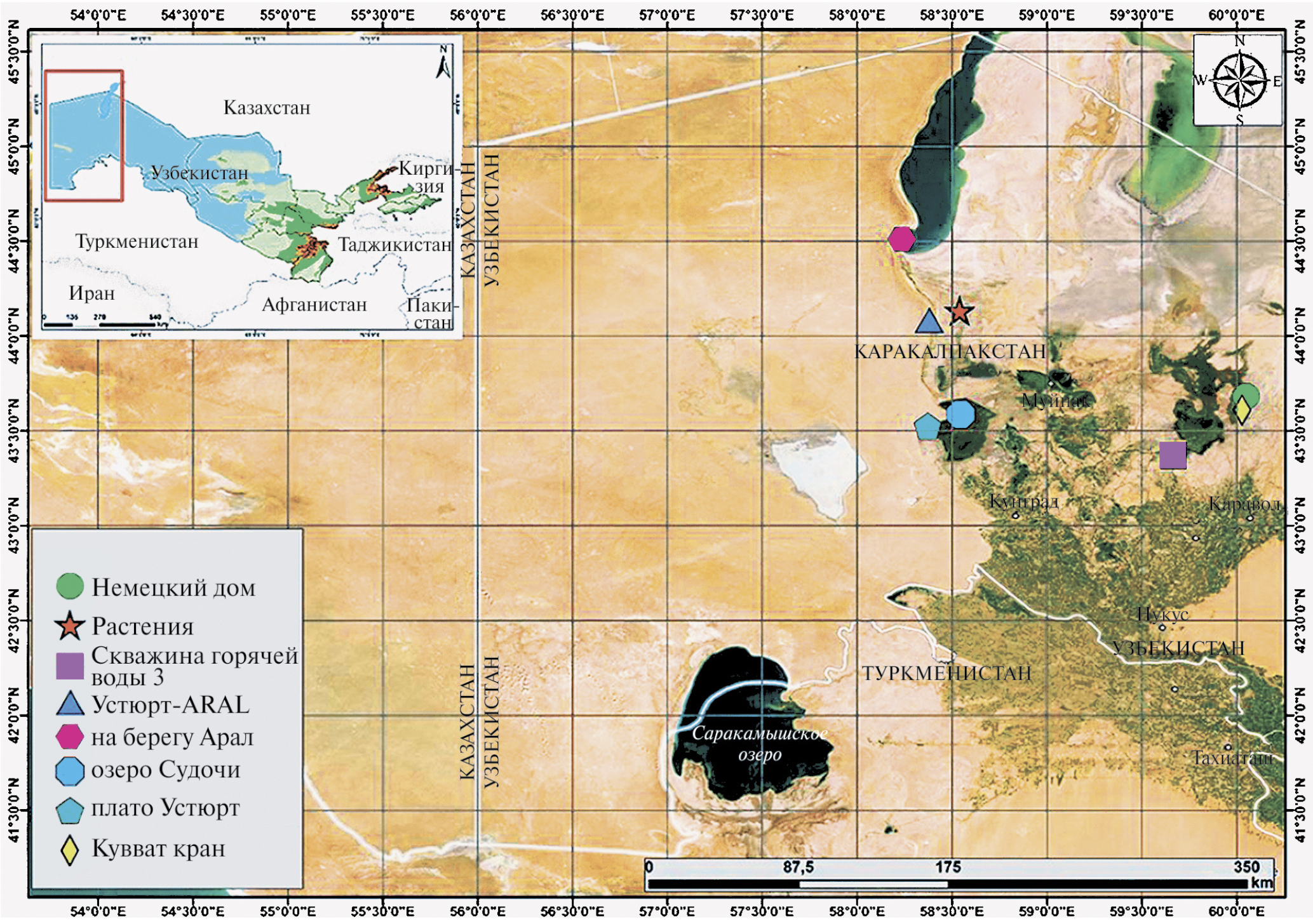 Отбор образцов для исследования. Образцы воды, осадков и грунта были отобраны осенью 2022 г. из Западного Арала, пустыни Аралкум, с плато Устюрт и из озера Судочье (рис. 1, таблица).