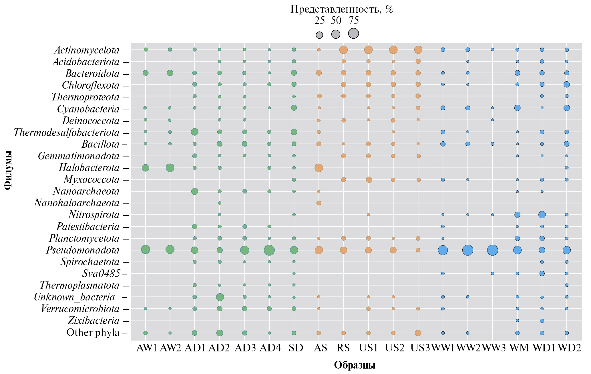 Во всех без исключения образцах доминируют представители филума Pseudomonadota, однако, учитывая высокое филогенетическое и метаболическое разнообразие внутри этого филума, его высокая представленность не поддается интерпретации.