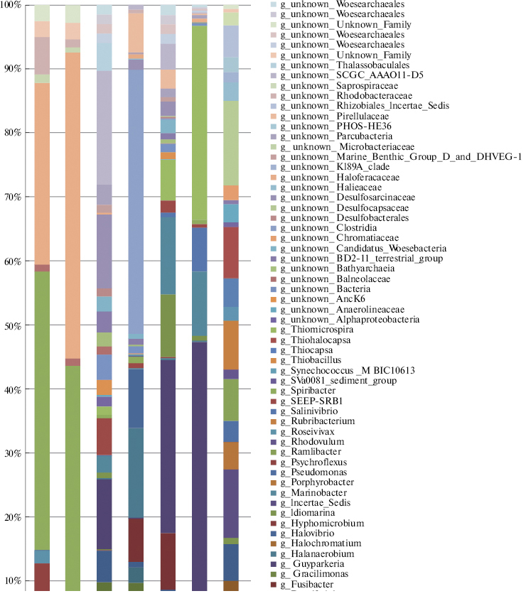 Рис. S1. Гистограмма, отражающая филогенетический состав (уровень семейства или рода) по результатам профилирования по гену 16S рРНК микробных сообществ воды, донных осадков и грунта Западного Аральского моря, а также донного осадка озера Судочье