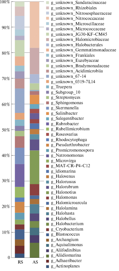 Рис. S2. Гистограмма, отражающая филогенетический состав (уровень рода) по результатам профилирования по гену 16S рРНК микробных сообществ, взятых на берегу Западного Аральского моря, состоящая из влажного песка и из ризосферы терескена – Krascheninnikovia еwersmanniana (RS и AS)