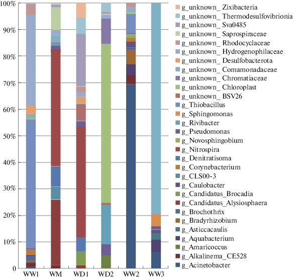 Рис. S4. Гистограмма, отражающая филогенетический состав (уровень рода) по результатам профилирования по гену 16S рРНК микробных сообществ, приуроченных к пресноводным скважинам (WW1-WW3, WM, WD1-WD2)