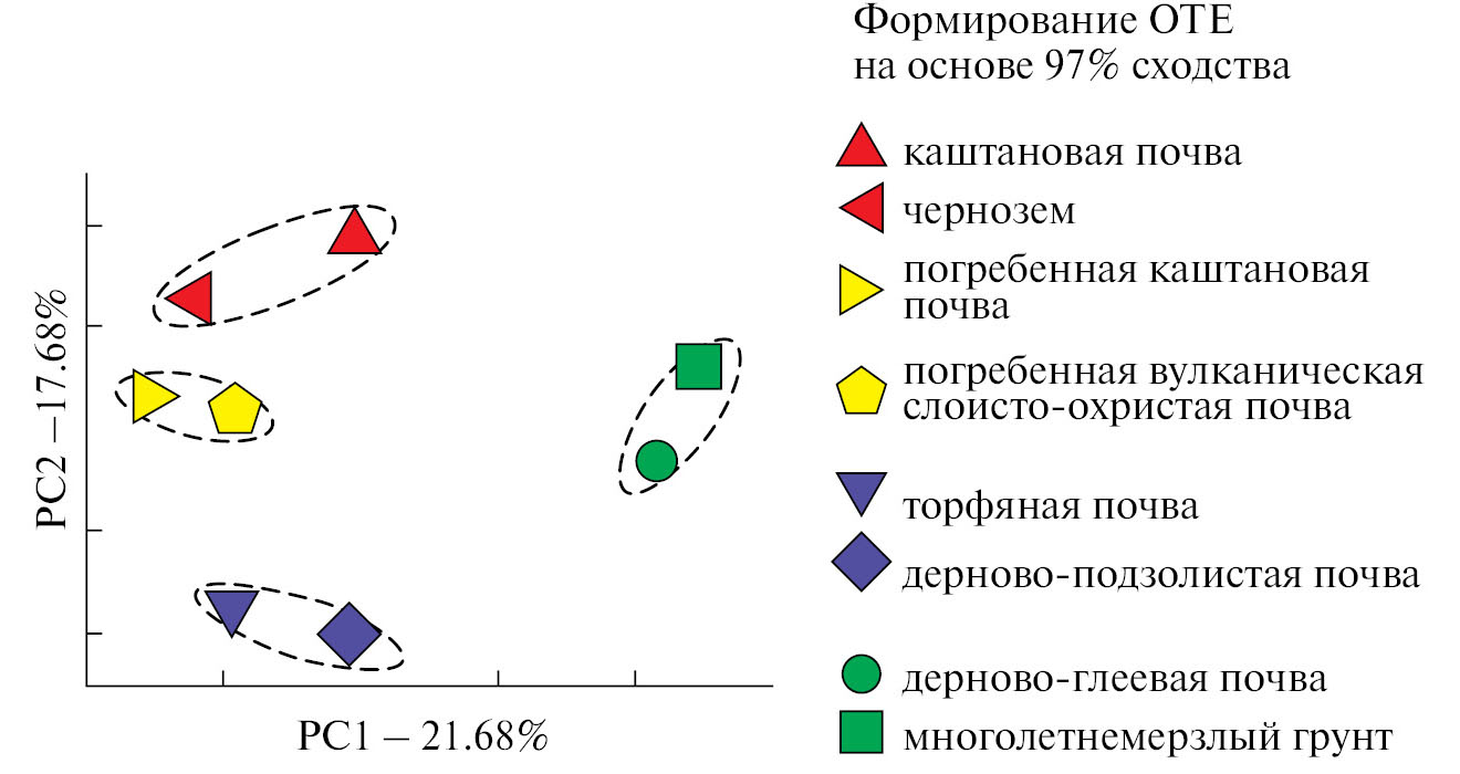 Анализ бета-разнообразия методом главных компонент с применением метрики Брея‒Кертиса на уровне сходства 97% достоверно разделил доминанты гидролитического сообщества между исследуемыми образцами на четыре кластера: современные почвы южных широт (каштановая, чернозем), современные почвы северной и центральной части России (дерново-подзолистая, торфяная), погребенные почвы и многолетнемерзлые грунты (рис. 1).