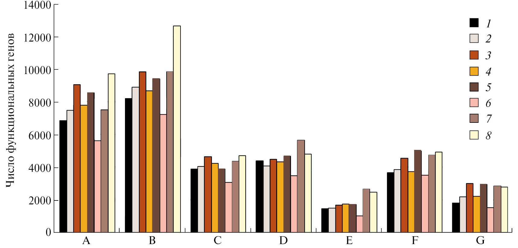 Рис. 2. Биодеградация ксенобиотиков: A — аминобензоат; B — бензоат; C — капролактамы; D — хлороалканы/хлороалкены; E — хлороциклогексан/хлоробензен; F — нафталин; G — ПАУ. Исследуемые образцы: 1 ‒ чернозем; 2 ‒ чернозем, инкубируемый с ресурсом; 3 — каштановая почва с ресурсом; 4 — каштановая почва; 5 — дерново-подзолистая почва, инкубируемая с ресурсом; 6 ‒ дерново-подзолистая почва; 7 ‒ многолетнемерзлый грунт; 8 ‒ многолетнемерзлый грунт, инкубированный с ресурсом.
