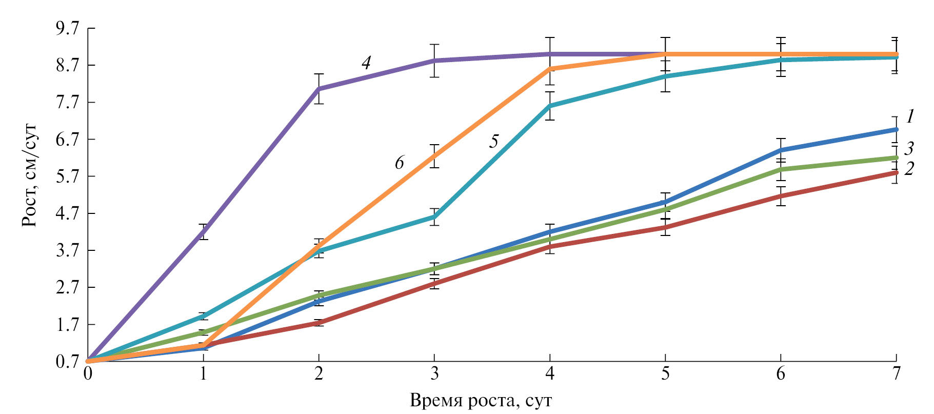 Рис. 1. Скорость роста микроорганизмов на плотной питательной среде (M ± ς): 1 ‒ Fusarium (orthoceras) oxysporum; 2 — Alternaria botrytis; 3 — Stemphylium botryosum; 4 — Phytophthora drechsleri; 5 — Trichoderma atroviride; 6 — Trichoderma harzianum.