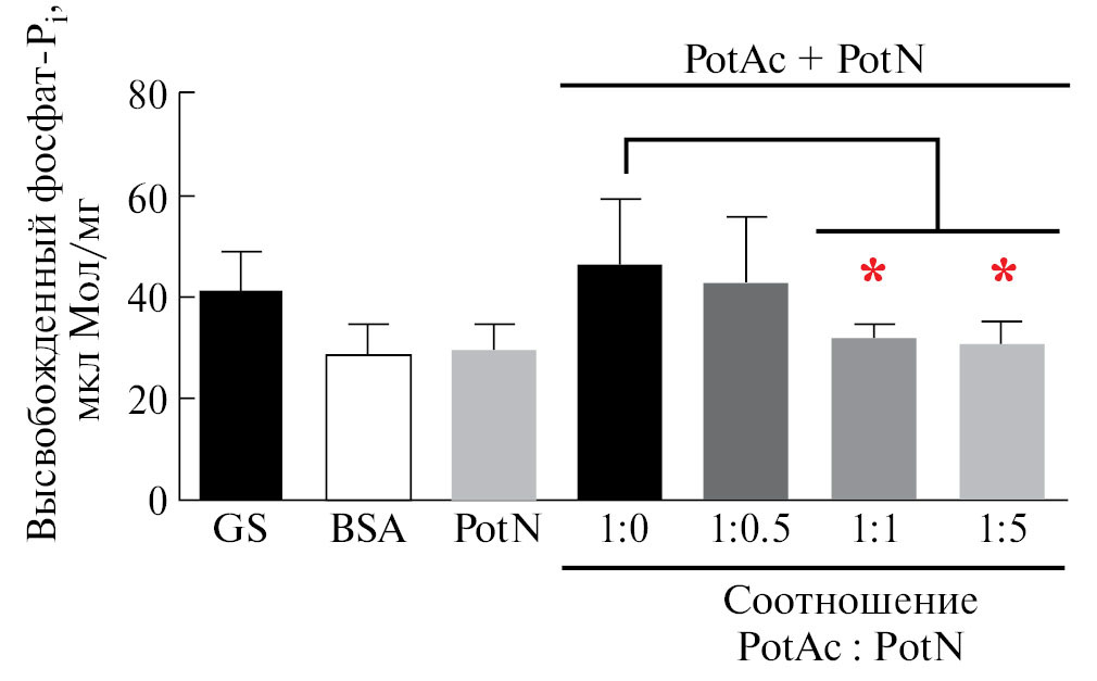Рис. 1. Влияние PotN на АТФазную активность PotAc. В качестве контроля были использованы глутаминсинтетаза (GS, положительный контроль) и бычий сывороточный альбумин (BSA, отрицательный контроль). На графике представлены средние значения ± стандартное отклонение из 3 повторов эксперимента. Значимость различий между комплексом PotN-PotAc и PotAc оценивали методом Крускала–Уоллиса с поправкой Шидака. Достоверными различия считали при *p < 0.05.