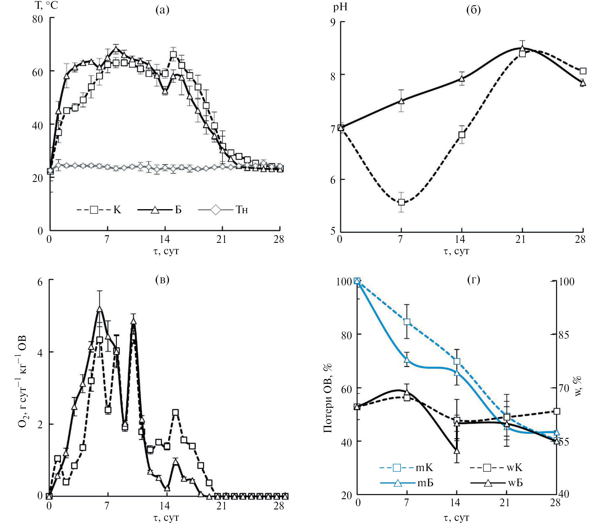 Рис. 1. Динамика изменений условий компостирования субстрата с биоаугментацией (Б) и контрольного субстрата (К): а — температура субстратов (Т), температура окружающей среды (Tн); б — рН; в-расход кислорода (О2); г — потери сухого ОВ (mK, mБ) и влажность (wK, wБ) (планки погрешностей представляют собой среднее значение ± стандартное отклонение).