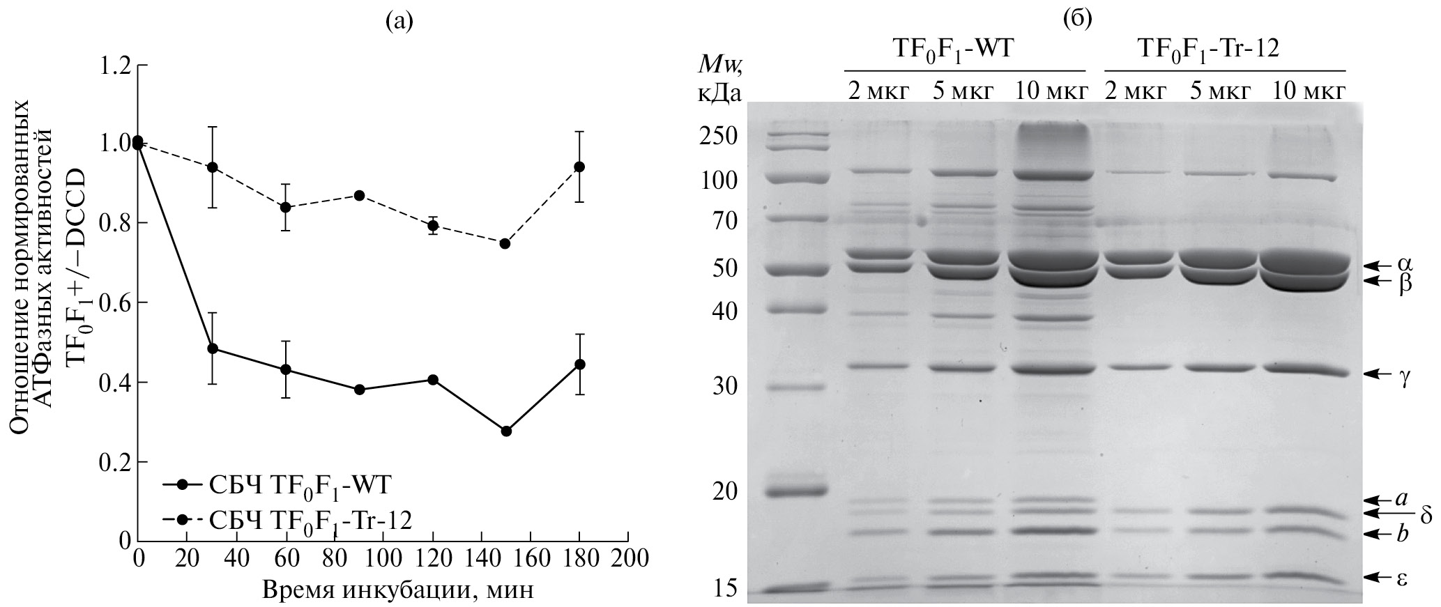 Рис. 2. а – Влияние инкубации с DCCD на АТФазную активность СБЧ с TF0F1-WT или TF0F1-Tr-12. Показаны отношения значения АТФазной активности в образце с DCCD к таковым в аналогичных контрольных образцах без DCCD. Точки, для которых показано стандартное отклонение, были воспроизведены в трех повторностях, остальные – средние, рассчитанные из двух повторов. б – субъединичный состав очищенных комплексов TF0F1-WT и TF0F1-Tr-12 (электрофорез в денатурирующих условиях в 12% полиакриламидном геле). Буквы справа указывают на отдельные субъединицы