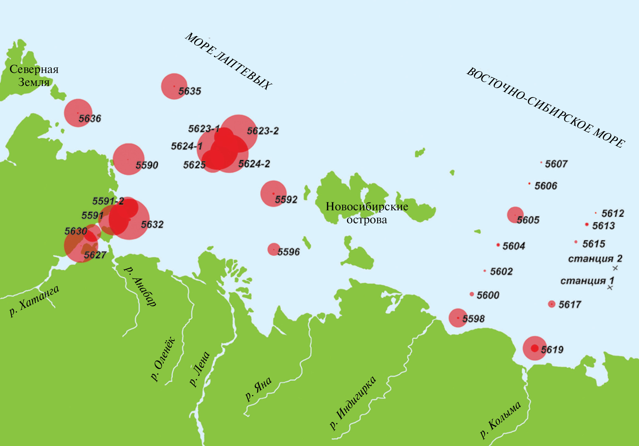Образцы грунтов отбирали в морях Лаптевых и Восточно-Сибирском в 69 рейсе НИС “Академик Мстислав Келдыш” (АМК69) в августе‒октябре 2017 года (Flint et al., 2018). Часть работ по материалам, собранным в этом рейсе, уже опубликованы: например, результаты изучения бактериопланктона (Bezzubova et al., 2020) и мейобентоса (Portnova et al., 2021). В этих же работах приводятся подробные характеристики станций, включенных и в наше исследование. Материалом для нашей работы послужили образцы грунтов, отобранные на 15 станциях в море Лаптевых (номера станций: 5590, 5591, 5591–2, 5592, 5596, 5623–1, 5623–2, 5624–1, 5624–2, 5625, 5627, 5630, 5632, 5635, 5636) и на 12 станциях в Восточно-Сибирском море (номера станций: 5598, 5600, 5602, 5604, 5605, 5606, 5607, 5612, 5613, 5615, 5617, 5619) (рис. 1).