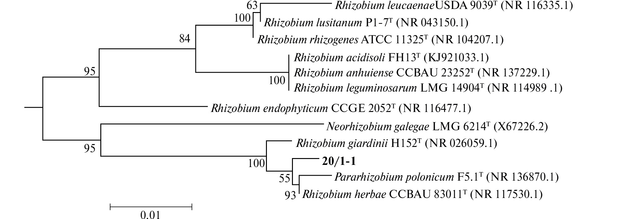 Штамм 20/1–1 показал близкое сходство rrs-гена (99.0, 99.22 и 99.62%) с тремя типовыми штаммами – Rhizobium giardinii H152T, Pararhizobium polonicum F5.1T и R. herbae CCBAU83011T соответственно.