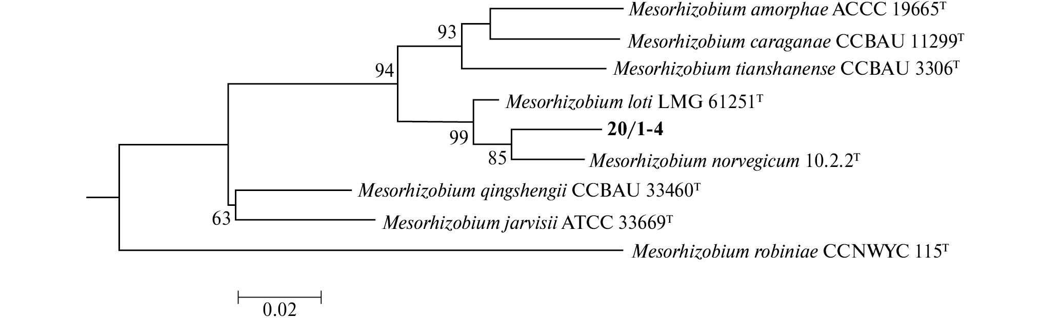 Для определения его видовой принадлежности было дополнительно проведено сравнение сходства конкатемеров генов atpD, dnaK, rpoB и gyrB между изолятом 20/1–4 и штаммами M. loti NZP2213T и M. norvegicum 10.2.2T. Показано, что штамм 20/1–4 наиболее близок (99.93%-е сходство) к штамму M. norvegicum 10.2.2T, тогда как сходство с M. loti NZP2213 составило 98.15% (табл. 1). На основании полученных результатов штамм 20/1–4 был отнесен к виду M. norvegicum.