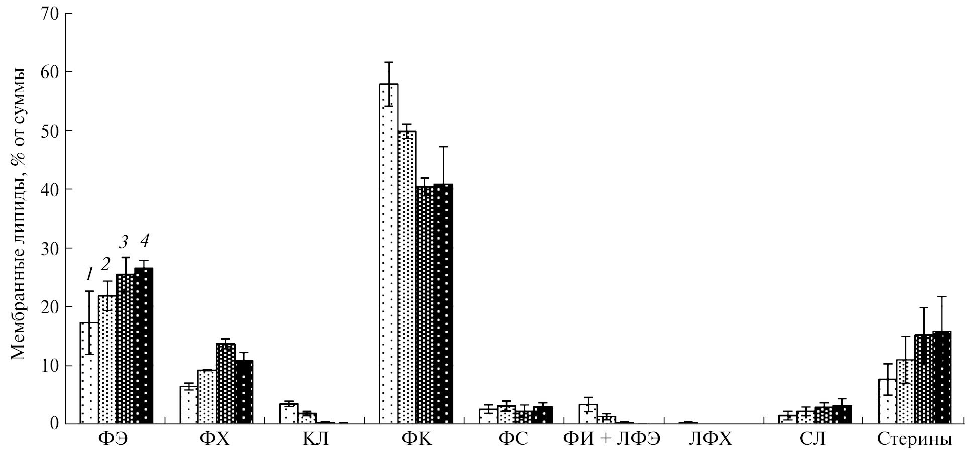 Рис. 4. Состав мембранных липидов в динамике роста M. flavus при 20°С. ФЭ ‒ фосфатидилэтаноламины, ФХ ‒ фосфатидилхолины, КЛ ‒ кардиолипины, ФК ‒ фосфатидные кислоты, ФС ‒ фосфатидилсерины, ФИ ‒ фосфатидилинозиты, ЛФЭ ‒ лизофосфатидилэтаноламины, ЛФХ ‒ лизофосфатидилхолины, СЛ ‒ сфинголипиды. 1 ‒ 1 сут, 2 ‒ 2 сут, 3 ‒ 3 сут, 4 ‒ 4 сут.