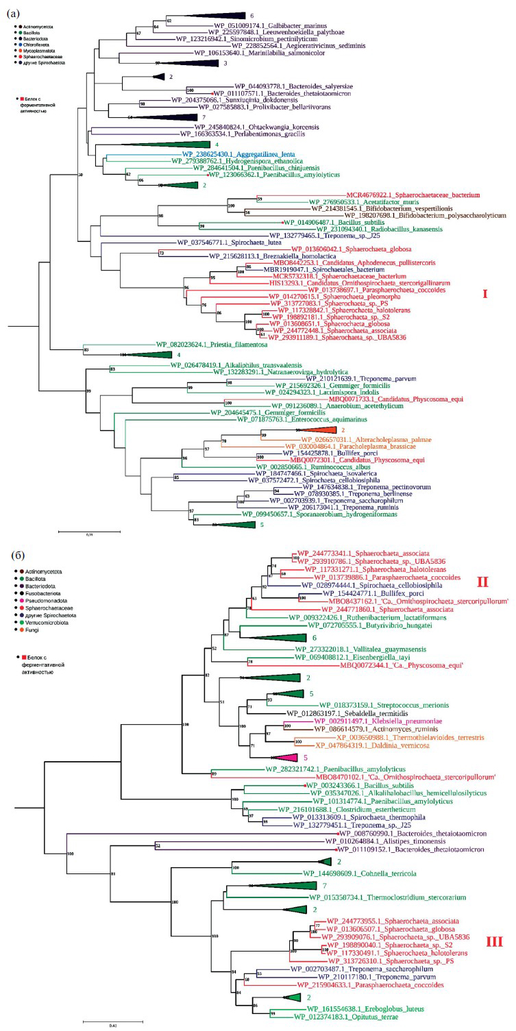 Рис. 1 (а, б). Филогенетическое древо белков семейства GH105 гликозил-гидролаз, закодированных в геномах Sphaerochaetaceae, построенное методом наибольшего правдоподобия: а ‒ рисунок отражает филогенетическое положение белка WP_244772448.1 из S. associata и его гомологов; анализ включал 94 аминокислотные последовательности; б ‒ рисунок отражает положение белков WP_244773341.1 , WP_244771860.1 , WP_244773955.1 из S. associata и их гомологов. Анализ включал 74 аминокислотные последовательности. Цветовые обозначения для крупных таксонов указаны на рисунке вверху слева. Белки с определенной ферментативной активностью, а именно d-4,5-ненасыщенная рамногалактуронил-гидролаза (WP_014906487.1, WP_003243366.1, WP_011109152.1) и d-4,5-ненасыщенная α-галактуронидаза (WP_008760990.1, WP_011107571.1, WP_123066362.1) обозначены. В точках ветвления указаны значения бутстрап-поддержки ≥50%. Масштаб указывает на количество замен на одно положение аминокислотной последовательности. Для упрощения отображения деревьев некоторые кластеры были схлопнуты в треугольники со сторонами, соответствующими средней длине ветвей в данном кластере. Количество последовательностей указано рядом с кластерами. Номера последовательностей и организмы в схлопнутых кластерах приведены в таблице S3 (по порядку сверху вниз) в приложении.