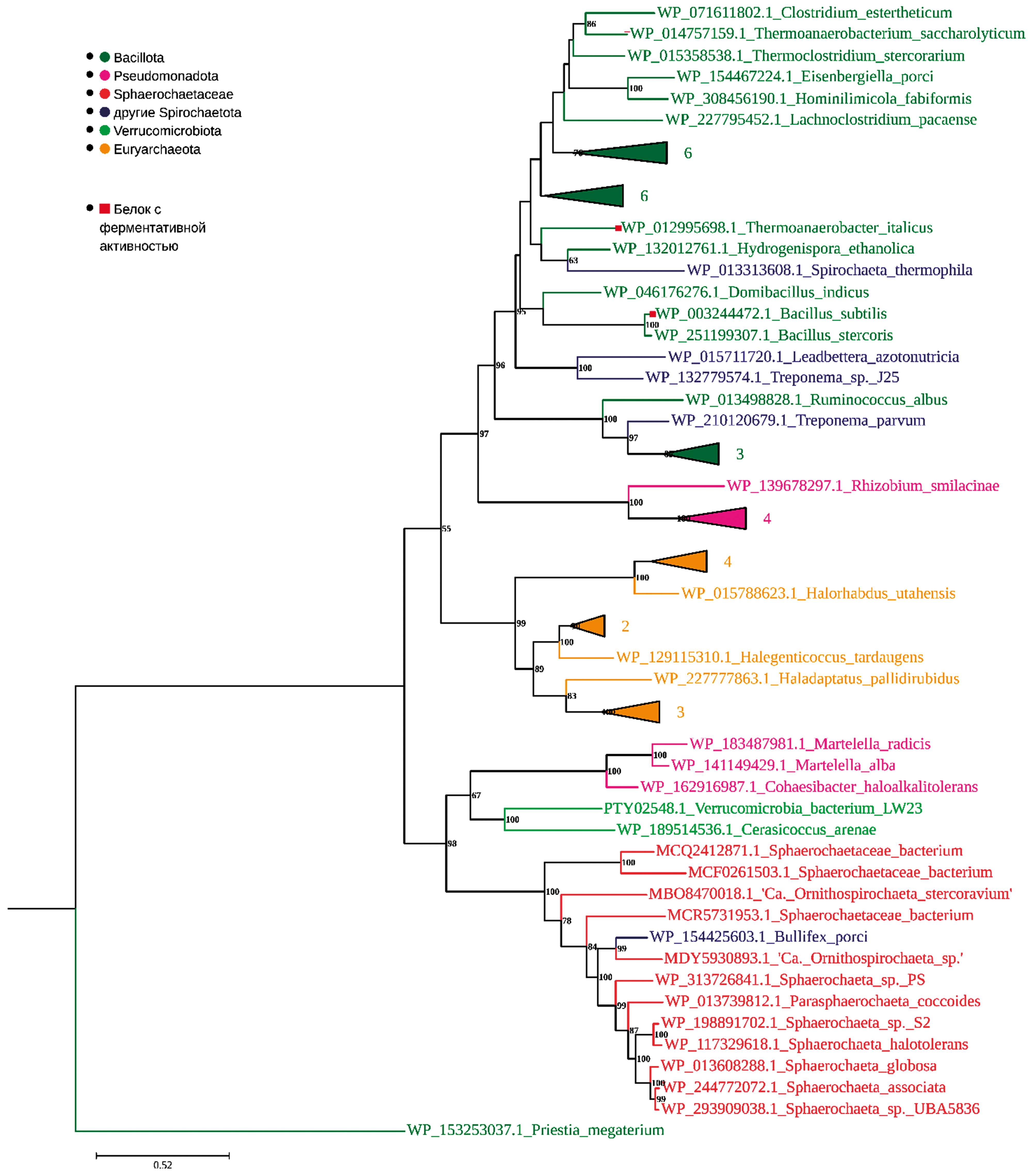 Рис. 2. Филогенетическое древо потенциальных α-галактуронидаз семейства GH4, закодированных в геномах Sphaerochaetaceae, построенное методом наибольшего правдоподобия. Анализ включал 67 белковых последовательностей. Значения бутстреп ≥50% указаны в точках ветвления. Масштабная линейка указывает на количество замен на одно положение аминокислотной последовательности. Цветовые обозначения для таксонов указаны на рисунке вверху слева. Белки с активностью α-галактуронидазы WP_003244472.1 и WP_012995698.1 обозначены. Для упрощения отображения деревьев некоторые кластеры были схлопнуты в треугольники со сторонами, соответствующими средней длине ветвей в данном кластере. Количество последовательностей указано рядом с кластерами. Номера последовательностей и организмы в схлопнутых кластерах приведены в таблице S3 в приложении.