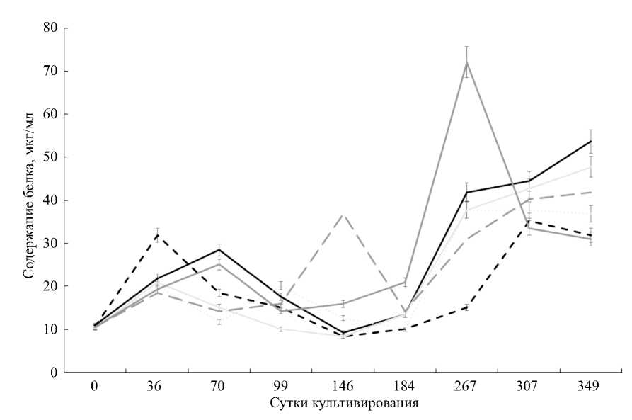 Содержание белка в вариантах с ВПС на протяжении эксперимента немного превышало содержание в вариантах без ВПС, к 267 сут в вариантах с СР и МГ условиями разница резко увеличилась, в случае НР условий разница увеличилась к 307 сут эксперимента (рис. 2).