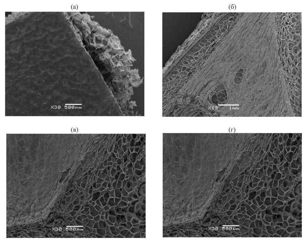 Рис. 6. Сканирующая электронная микроскопия поверхности ВПС: а ‒ химический контроль (среда без клеток); б – МГ условия; в – НР условия; г ‒ СР условия. Увеличение ×30.