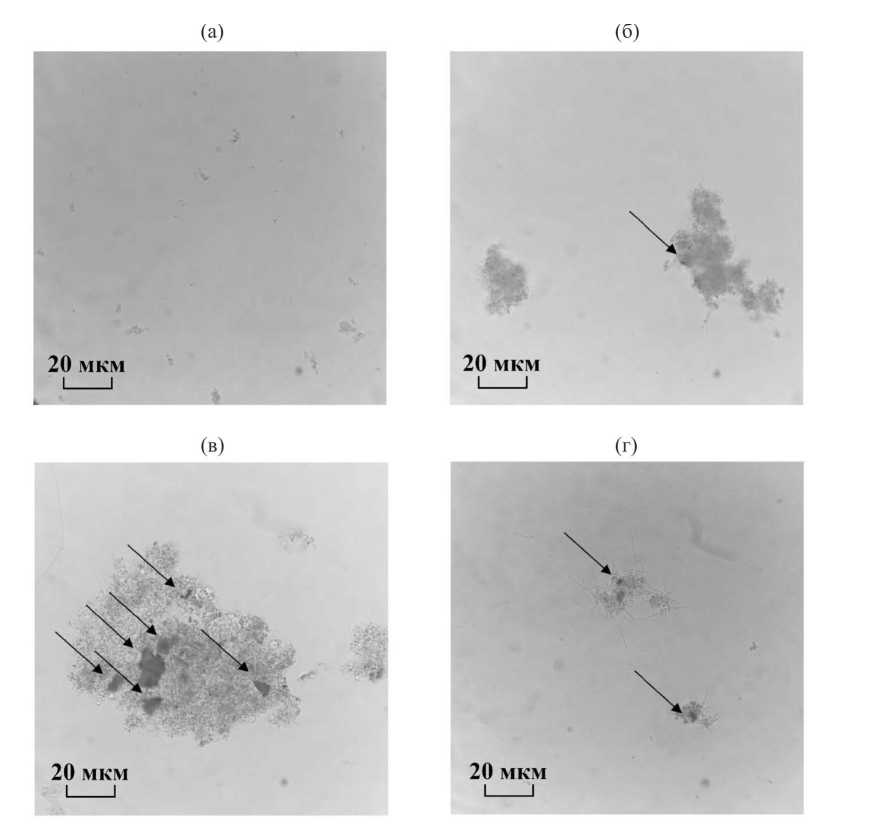 Рис. 7. Световая микроскопия культуральной жидкости микробного сообщества в присутствии ВПС: а ‒ химический контроль; б – МГ условия; в – НР условия; г – СР условия. Увеличение ×400.